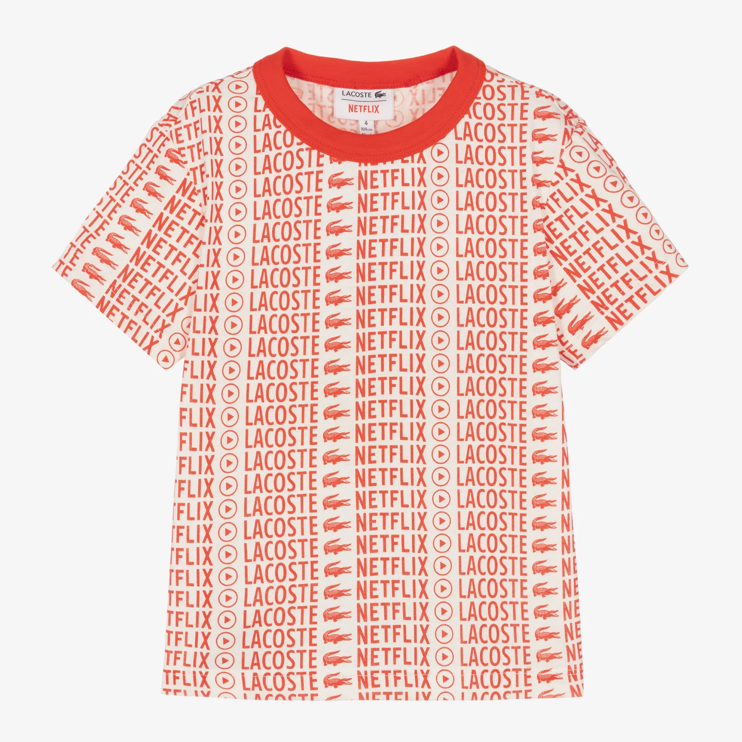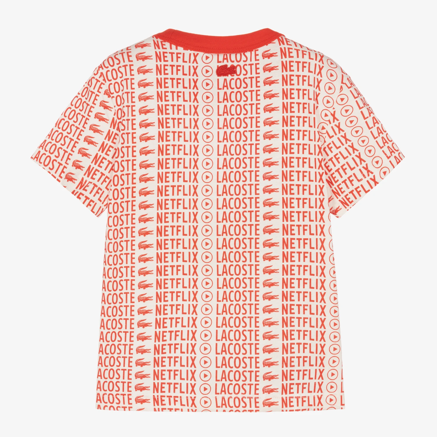 Off-white and red organic cotton T-shirt for boys and girls from Lacoste, made in comfortable jersey. It has a repeated bold red NETFLIX logo print, as part of a collaboration with the American media company. For an added designer touch the brand’s iconic crocodile logo patch is on the back in red.