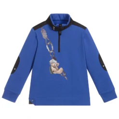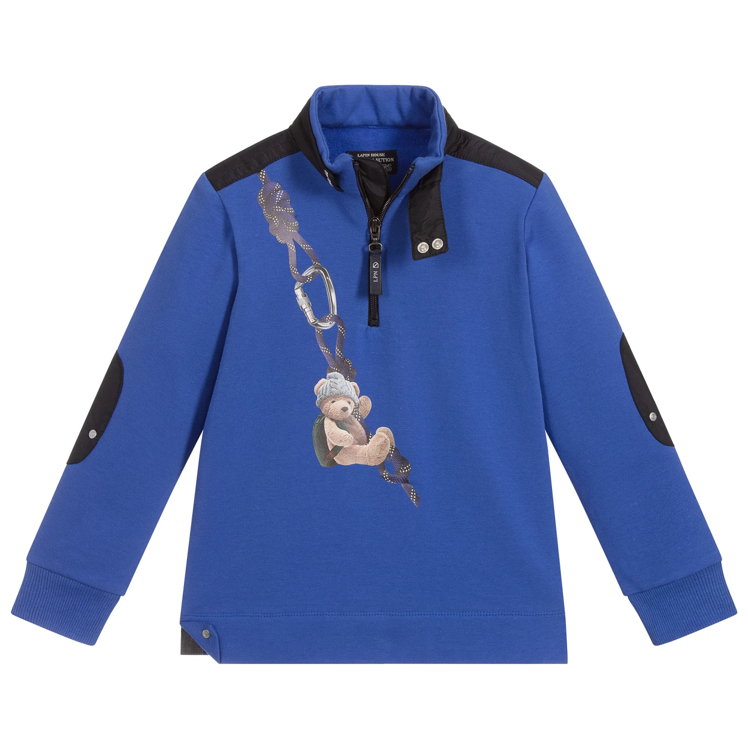 Boys blue sweatshirt from Lapin House, made in mid-weight sweatshirt jersey, with a brushed feel inside. It has black nylon trims and a beige teddy bear print on the chest. It fastens with a zip and popper on the front.