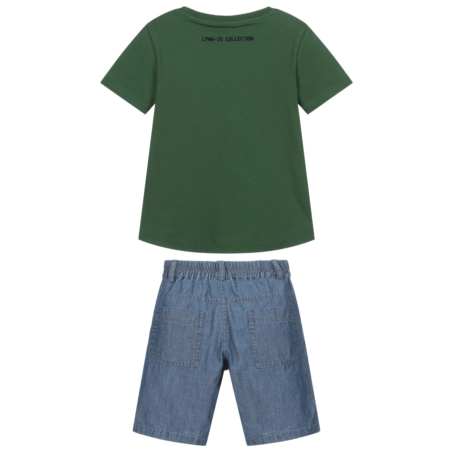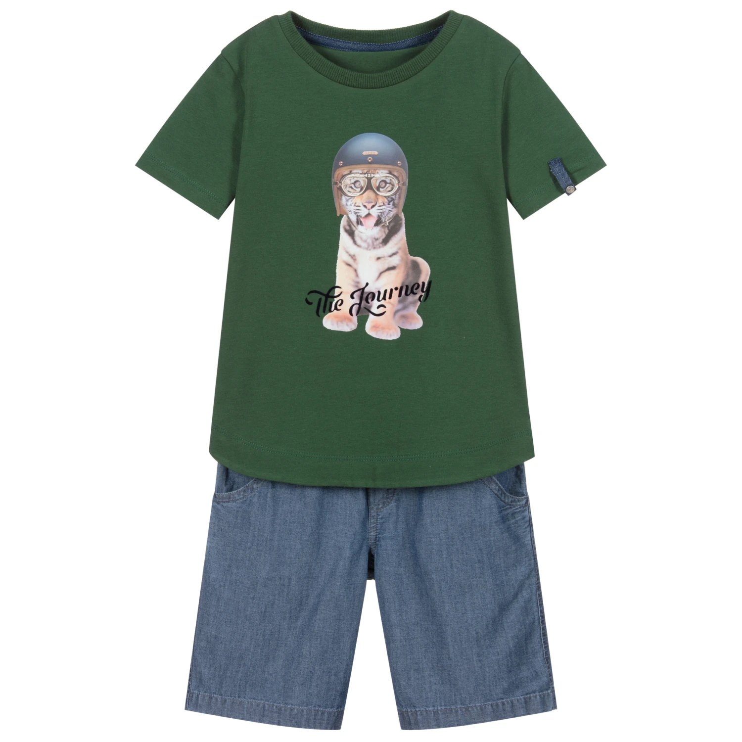 Boys T-shirt and shorts set by Lapin House. The green T-shirt has a cute tiger print and navy blue trims. The smaller sizes have poppers on the shoulder. The lightweight cotton shorts have the look of faded denim, and an elasticated waistband.