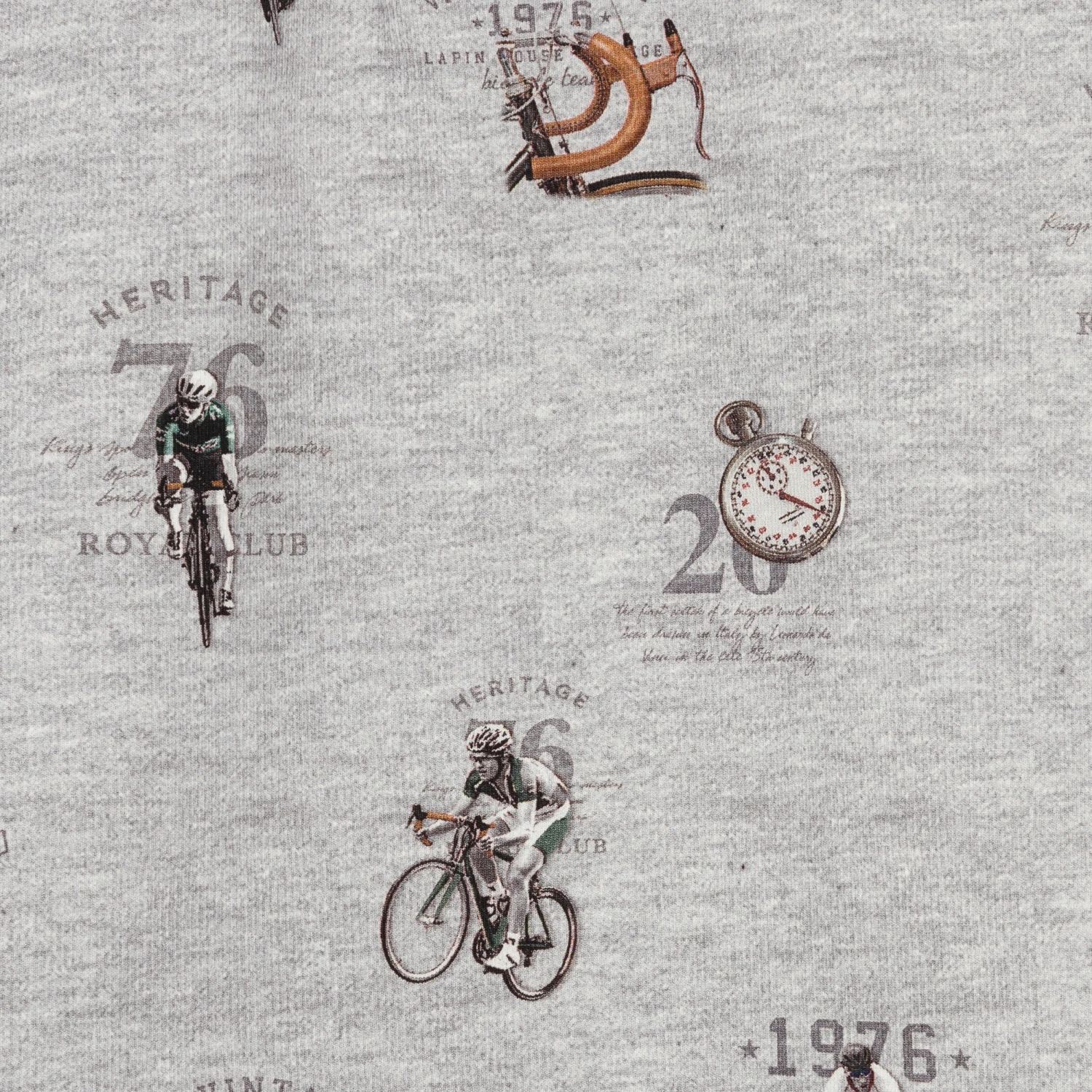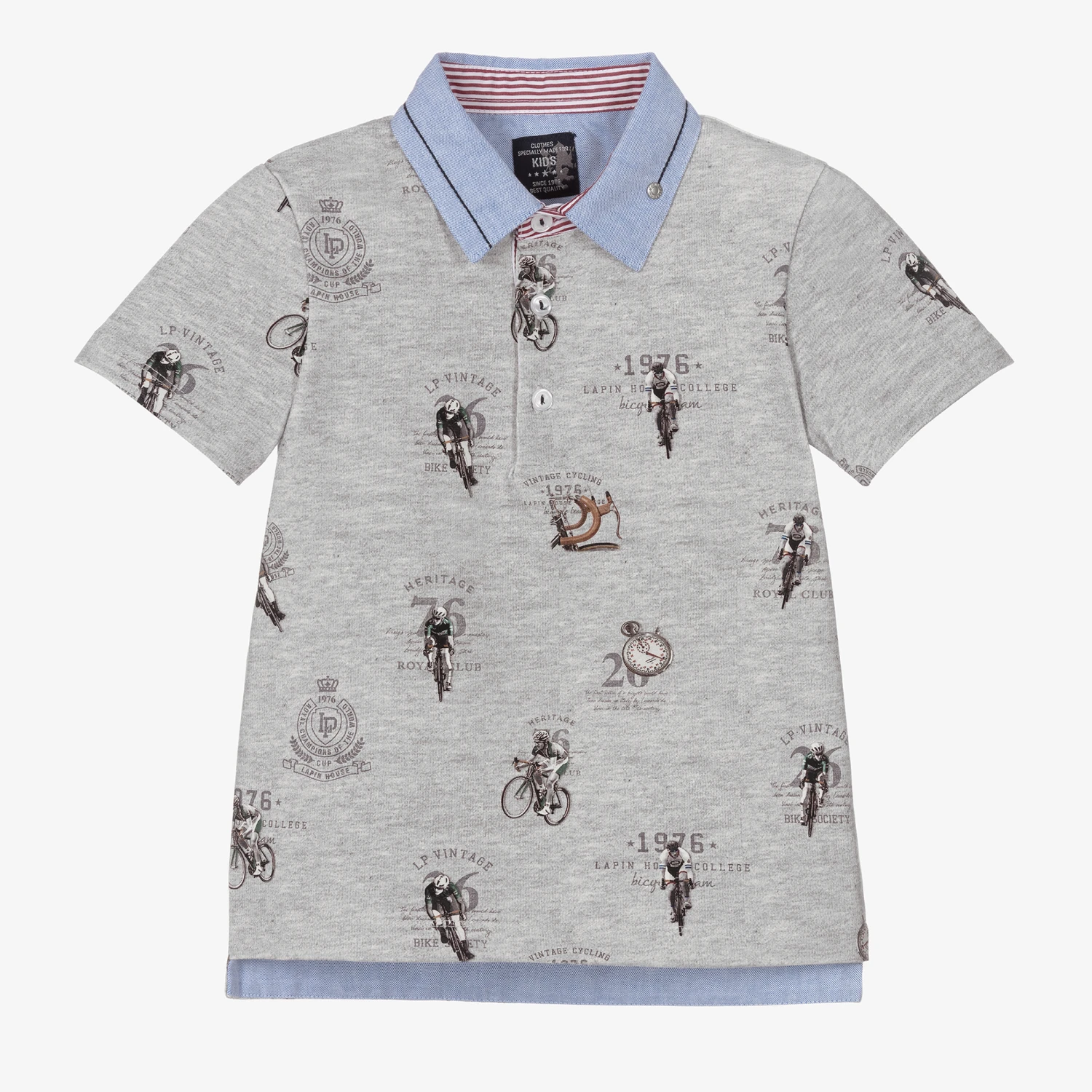 Boys grey polo shirt from Lapin House, with a cycling themed logo pattern. Made in soft cotton jersey, it has a contrast collar in blue Oxford cotton, with embroidered trim and a branded silver stud.