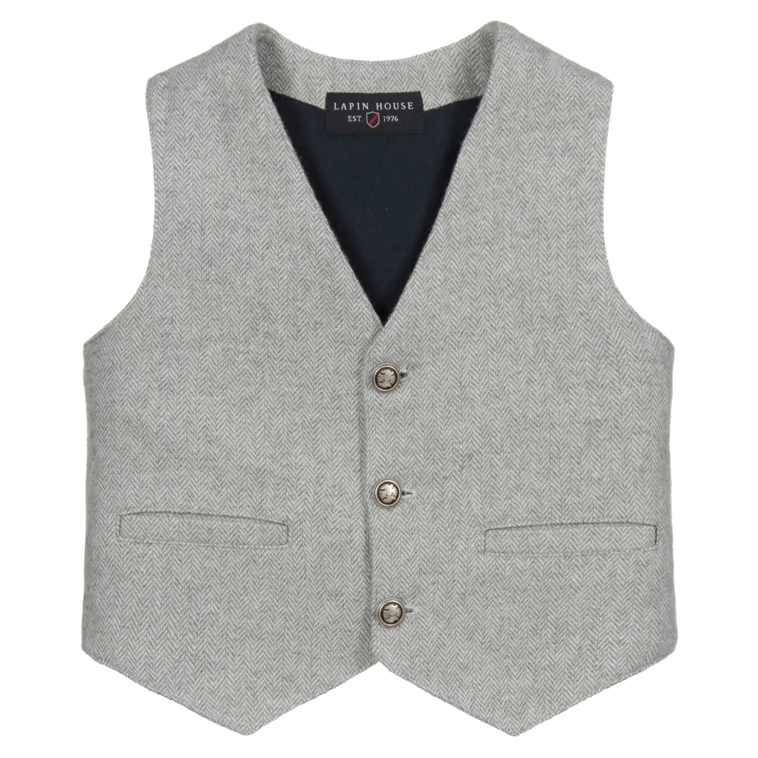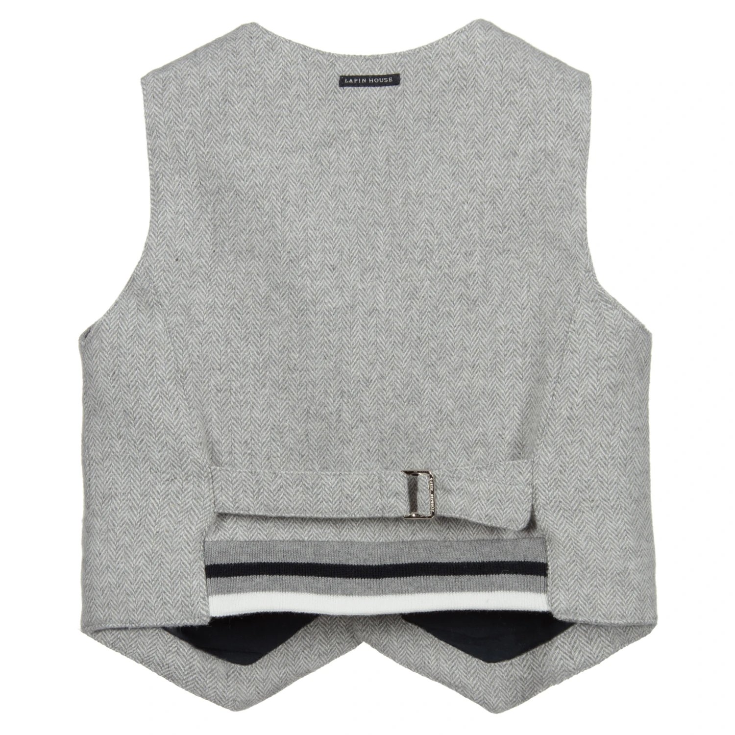 Boys grey wool waistcoat by Lapin House, with a lovely herringbone weave and a lightweight lining. There is an adjustable cinch on the back and a soft ribbed insert with grey, navy blue and white stripes. The waistcoat fastens with silver crested buttons and has welt pockets on the front.