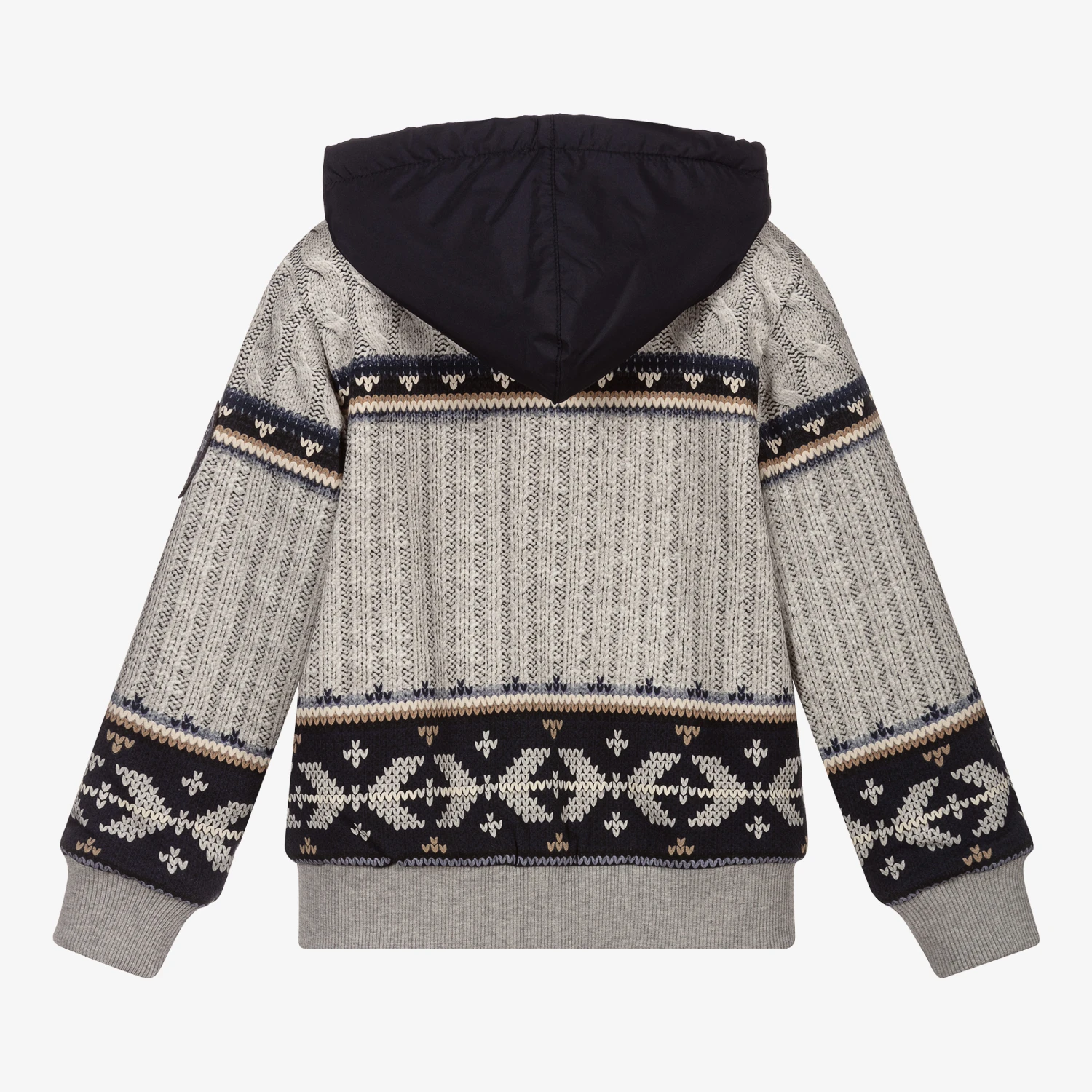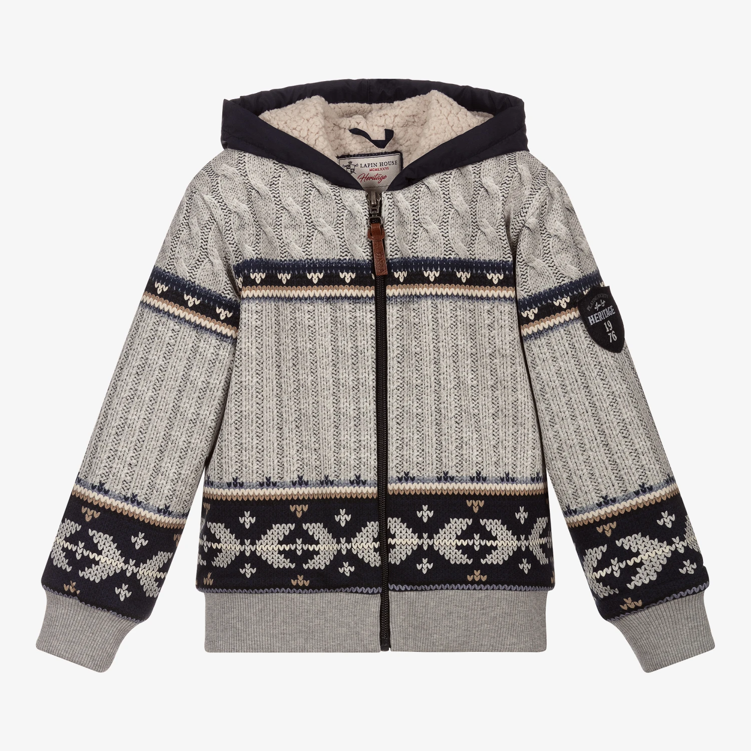 Grey and navy blue zip-up top for boys by Lapin House, made in soft and stretchy jersey. It has a knitted effect pattern, with a silky hood, ribbed trims and a navy blue appliqué logo badge on one sleeve. It has a super soft beige teddy fleece lining and a front zip fastening.