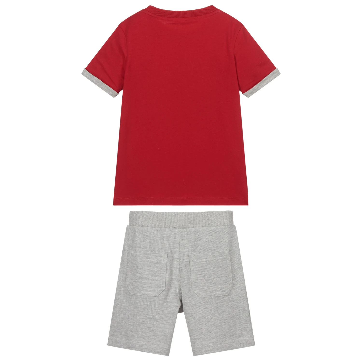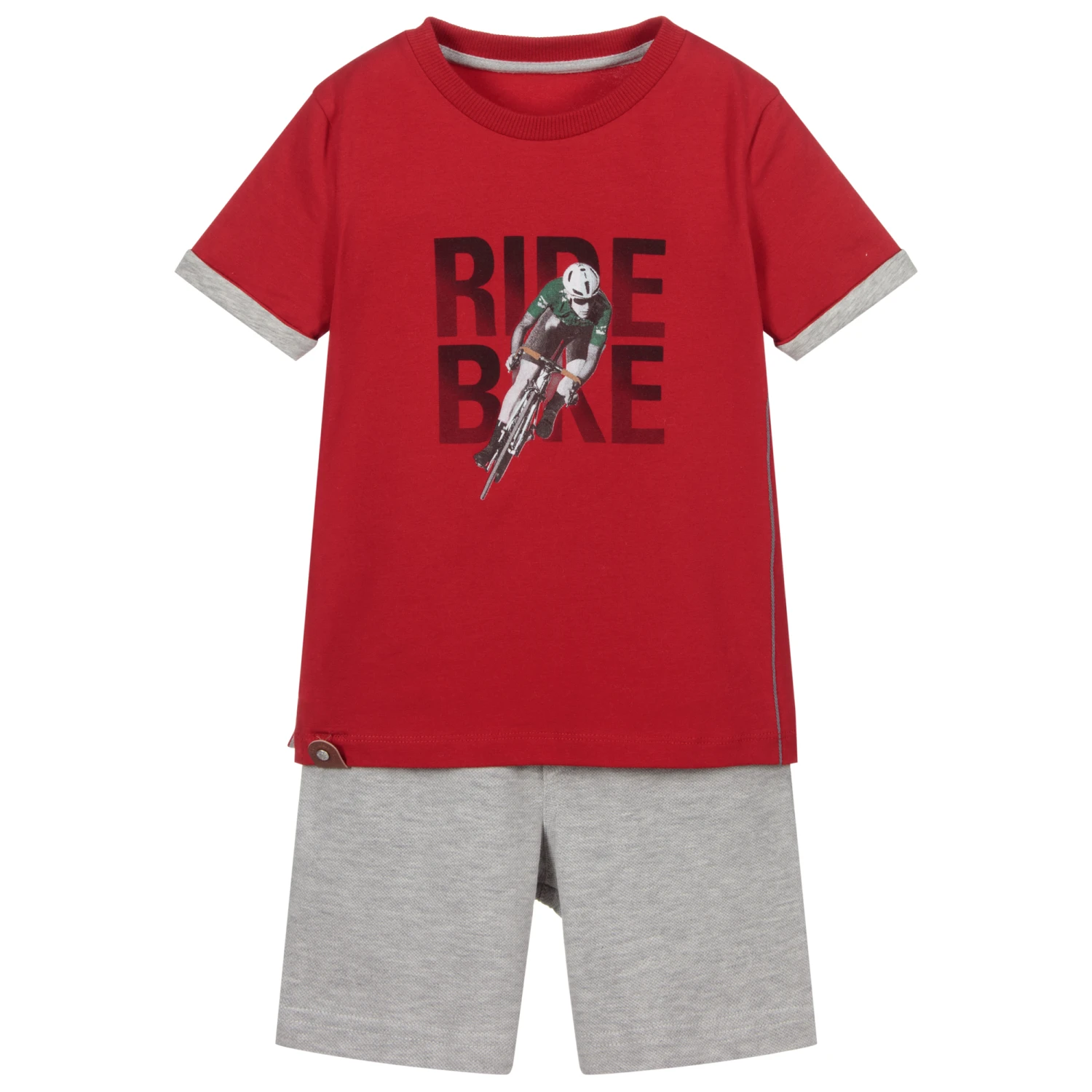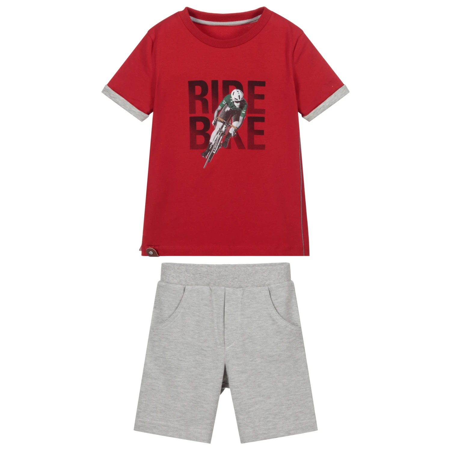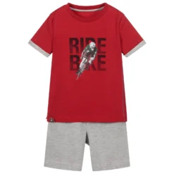 Boys T-shirt and shorts set by Lapin House. The red T-shirt has a black, white and green ‘Bike Ride’ print and grey trims. The smaller sizes have shoulder poppers. The grey piqué shorts have an elasticated waistband.