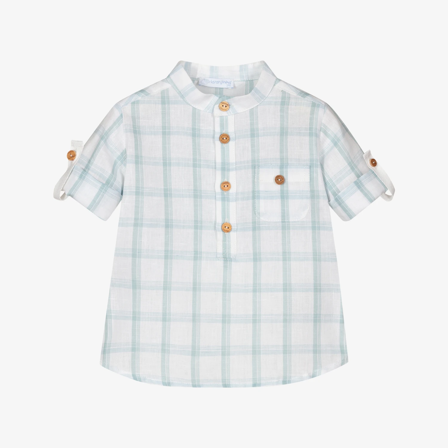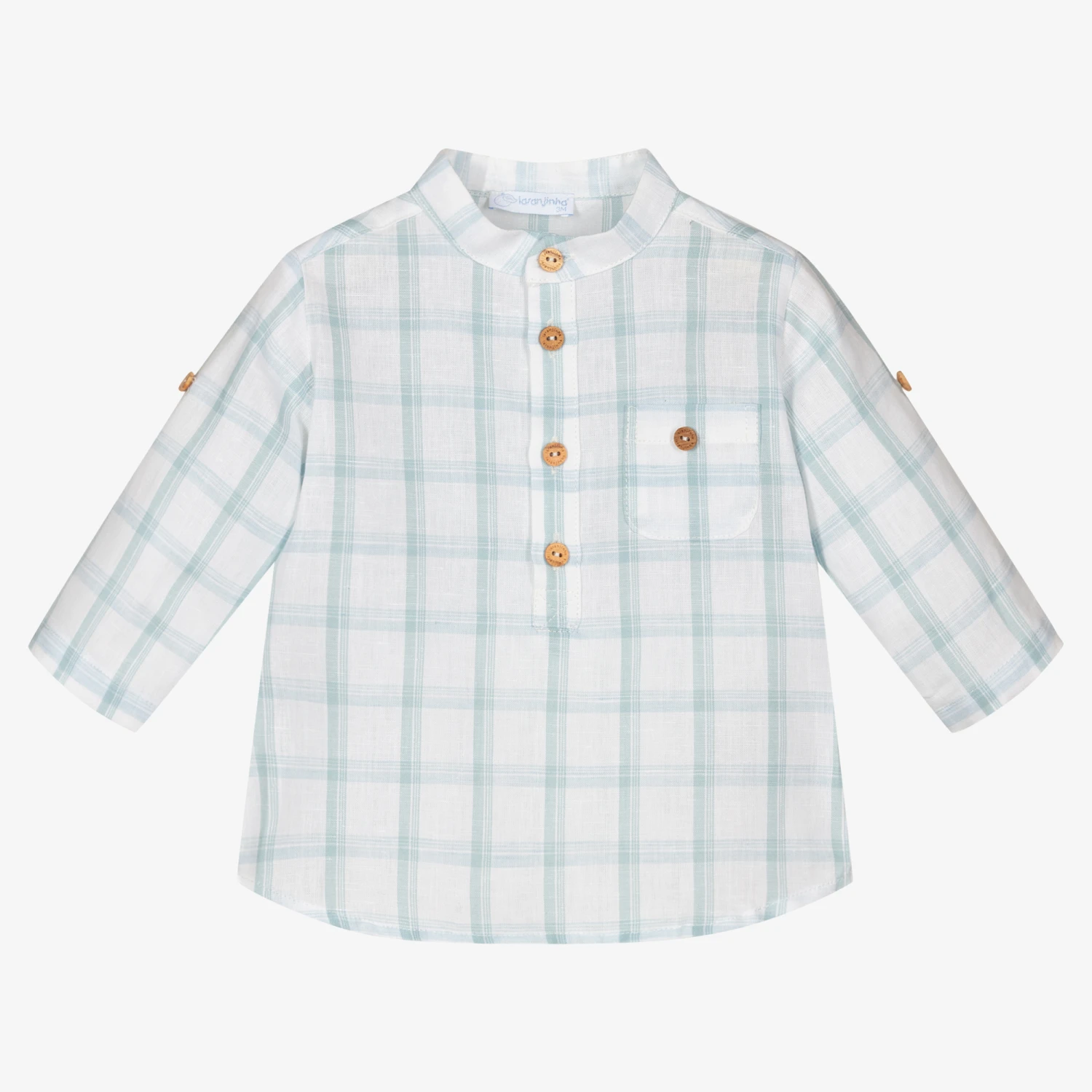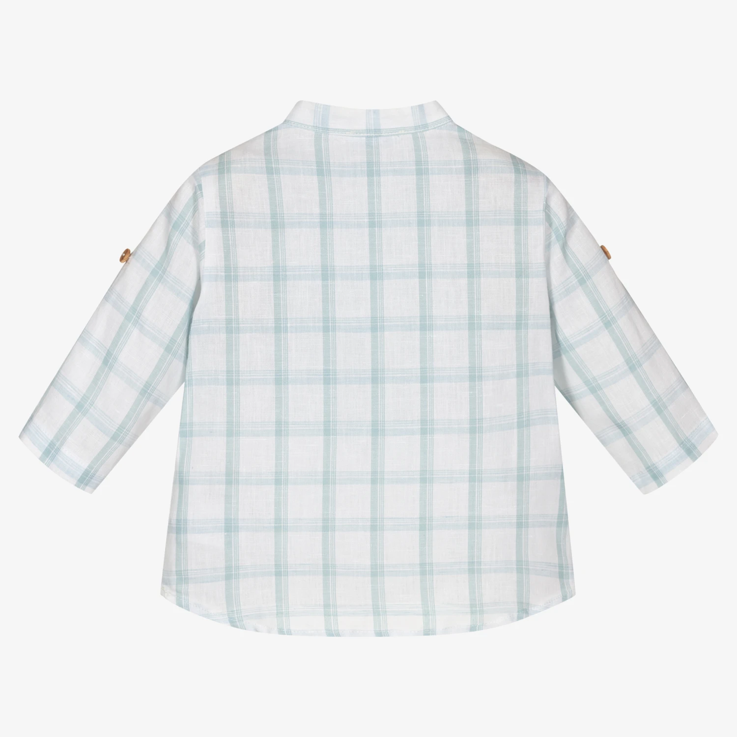 Aqua blue and white check, collarless shirt for boys by Laranjinha. Made in a lightweight cotton and linen blend, it has a decorative patch pocket and half placket opening with branded wooden button fastenings. The hem is curved and the sleeves can be rolled up and secured with a button.