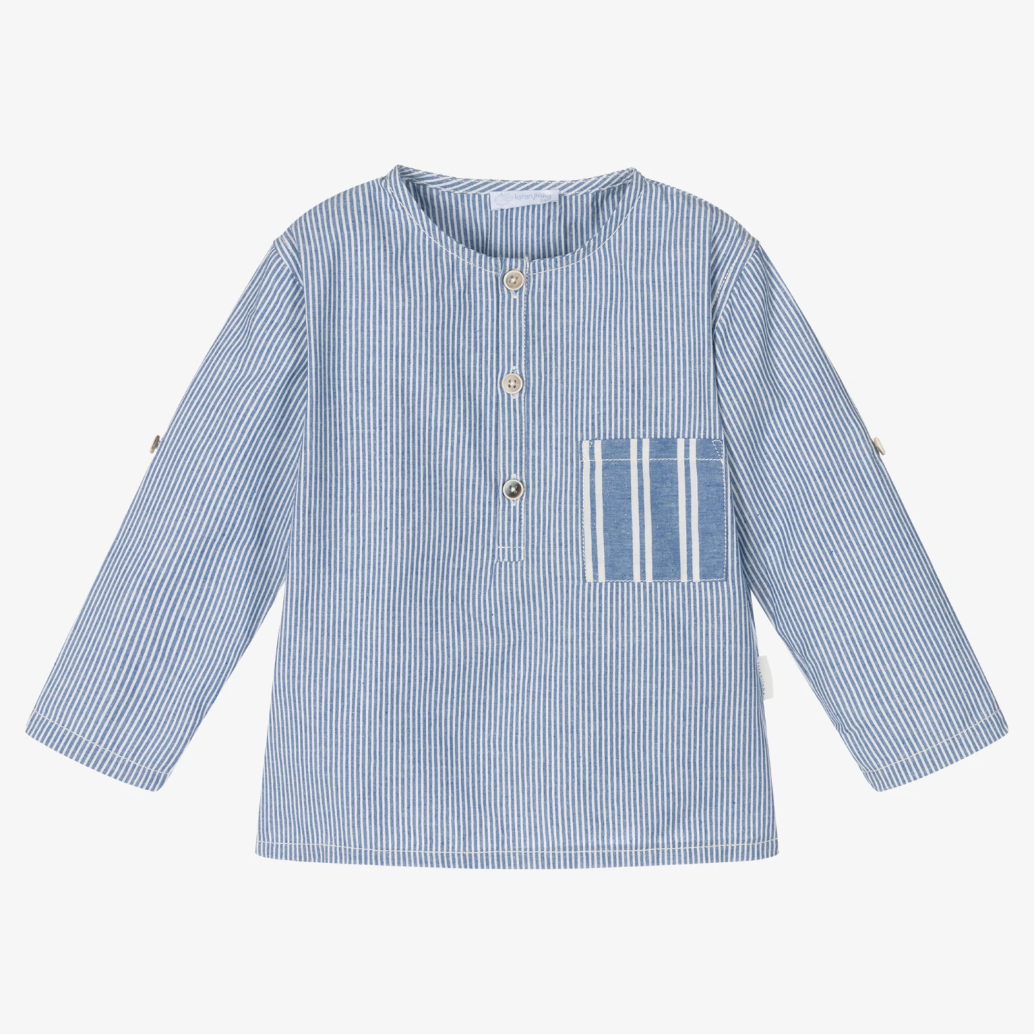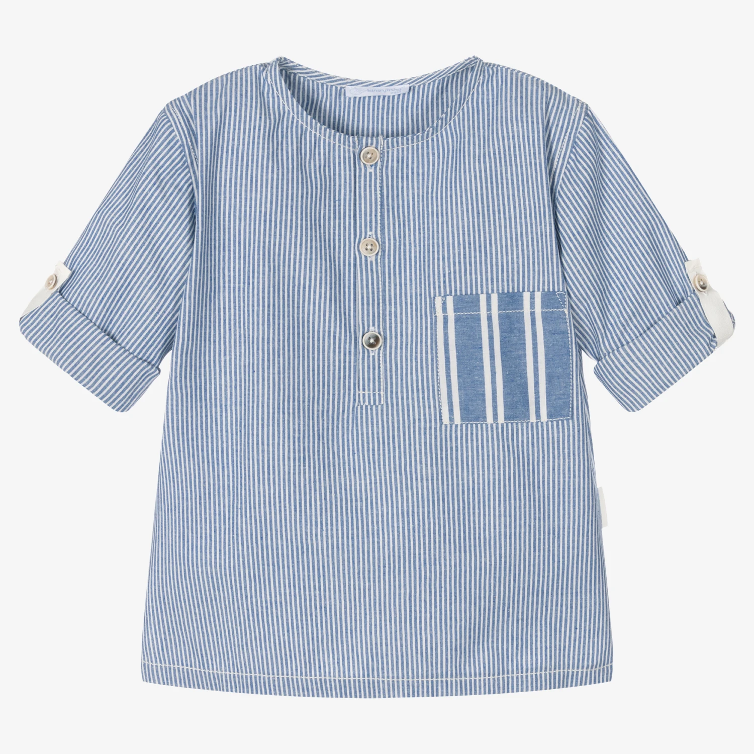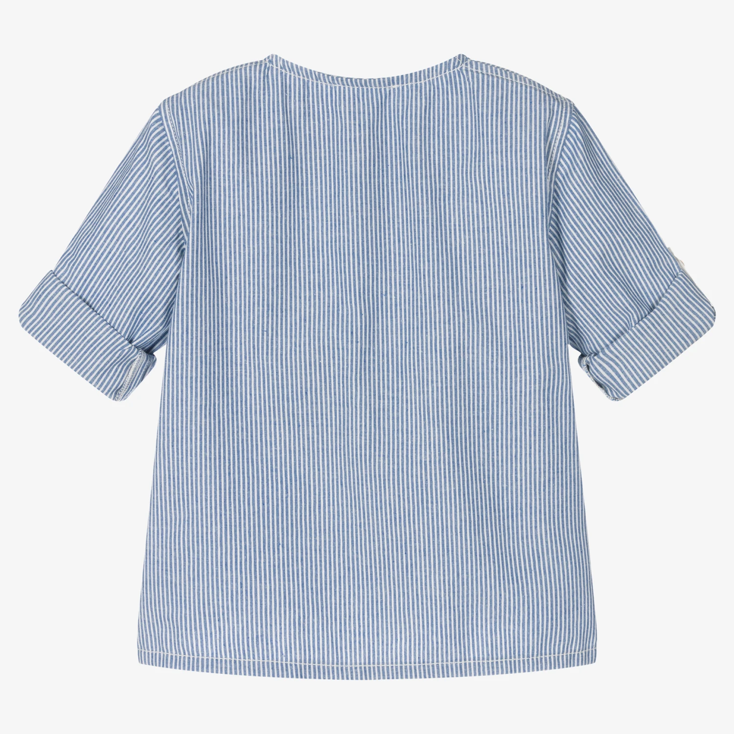 In a miniature stripe design, this blue and white popover shirt for boys is by Portuguese brand, Laranjinha. Made in a soft blend of organic and recycled cotton, this comfortable relaxed style has a round neck and a half button placket on the front. There is a contrast stripe chest pocket and the sleeves can be rolled up and secured with button tabs. For ease of movement, it has a split hem that is slightly longer at the back.