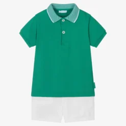 Casual shorts set for little boys by Portuguese brand Laranjinha. The green polo shirt has a contrasting ribbed green collar and is made in comfortable, cotton piqué, with logo button fastenings on the front. The white cotton shorts have a comfortable, elasticated waistband and faux front pockets, with a logo tab on one side seam.
