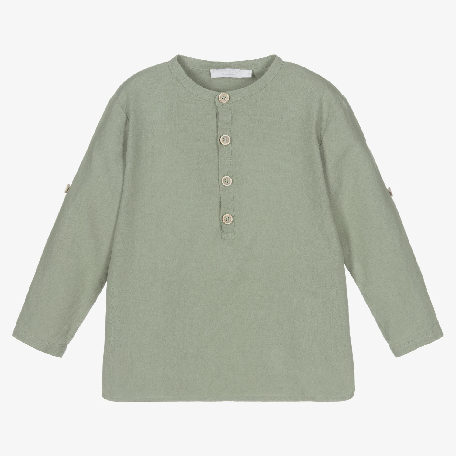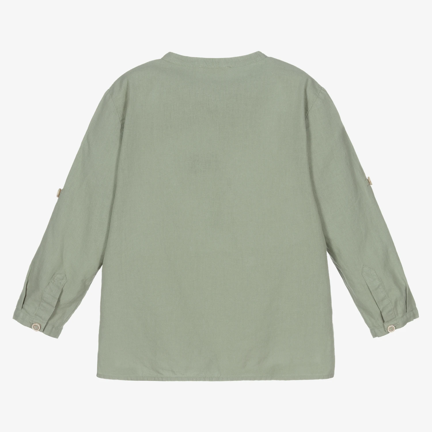 A lovely khaki green shirt for boys from Chic by Laranjinha. It is made in a comfortable blend of cotton and linen, in a collarless style. There are upper button fastenings, with button tabs on the sleeves.