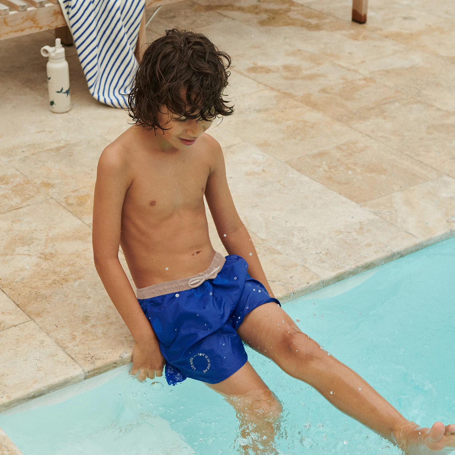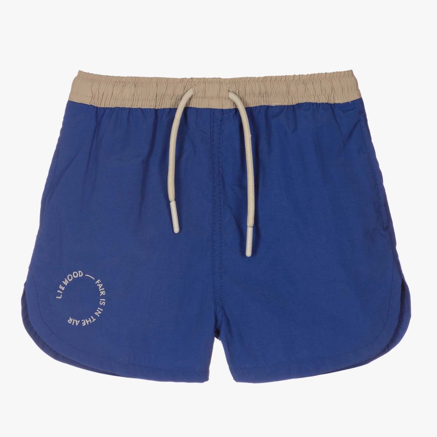 Bright blue swim shorts for boys by Danish brand Liewood, with a sun protection factor of 50+. Made from lightweight recycled nylon with a soft mesh lining, they have a grey elasticated waistband with a drawstring tie. The designer’s logo is embroidered in grey on the front, together with the words ‘Fair is in the air’.