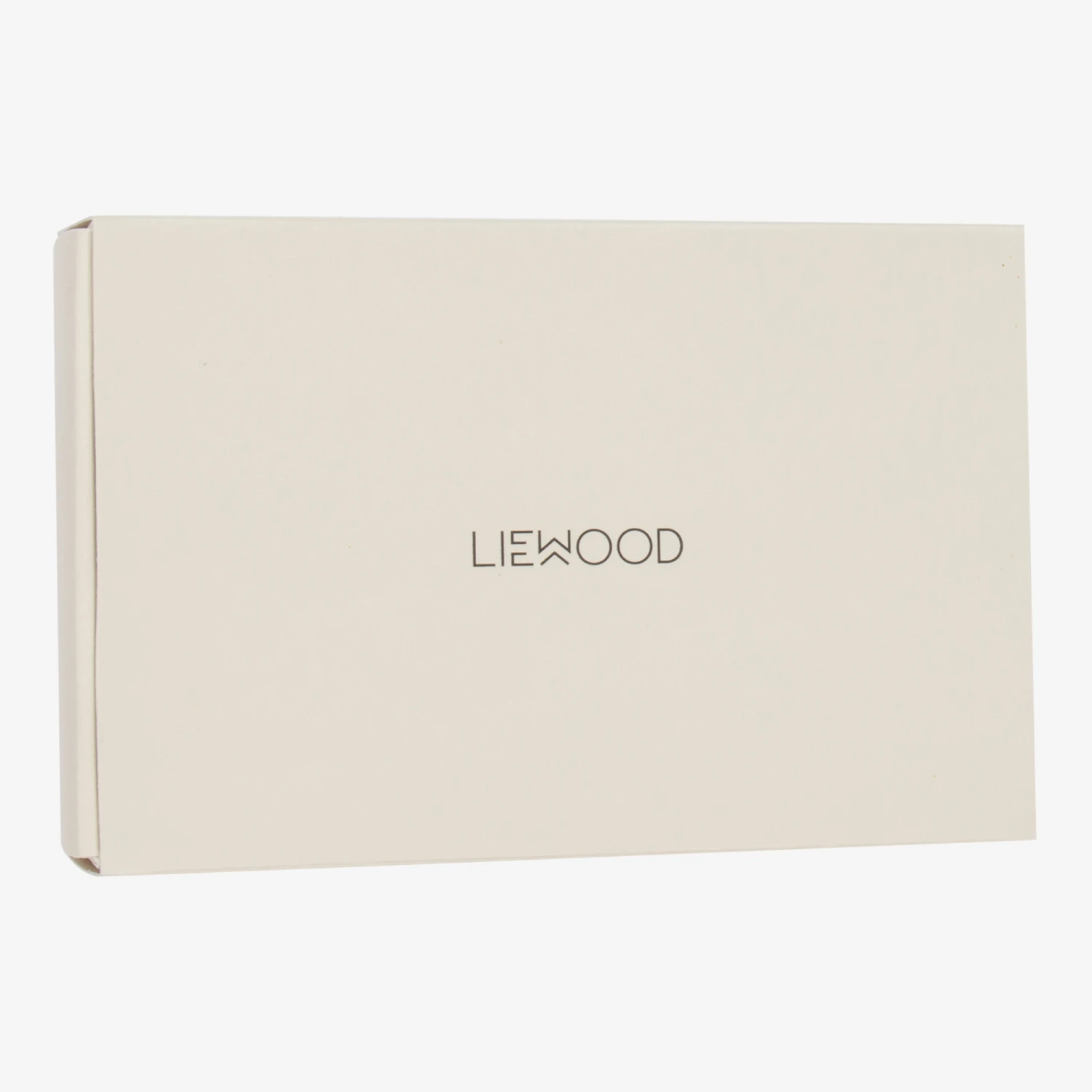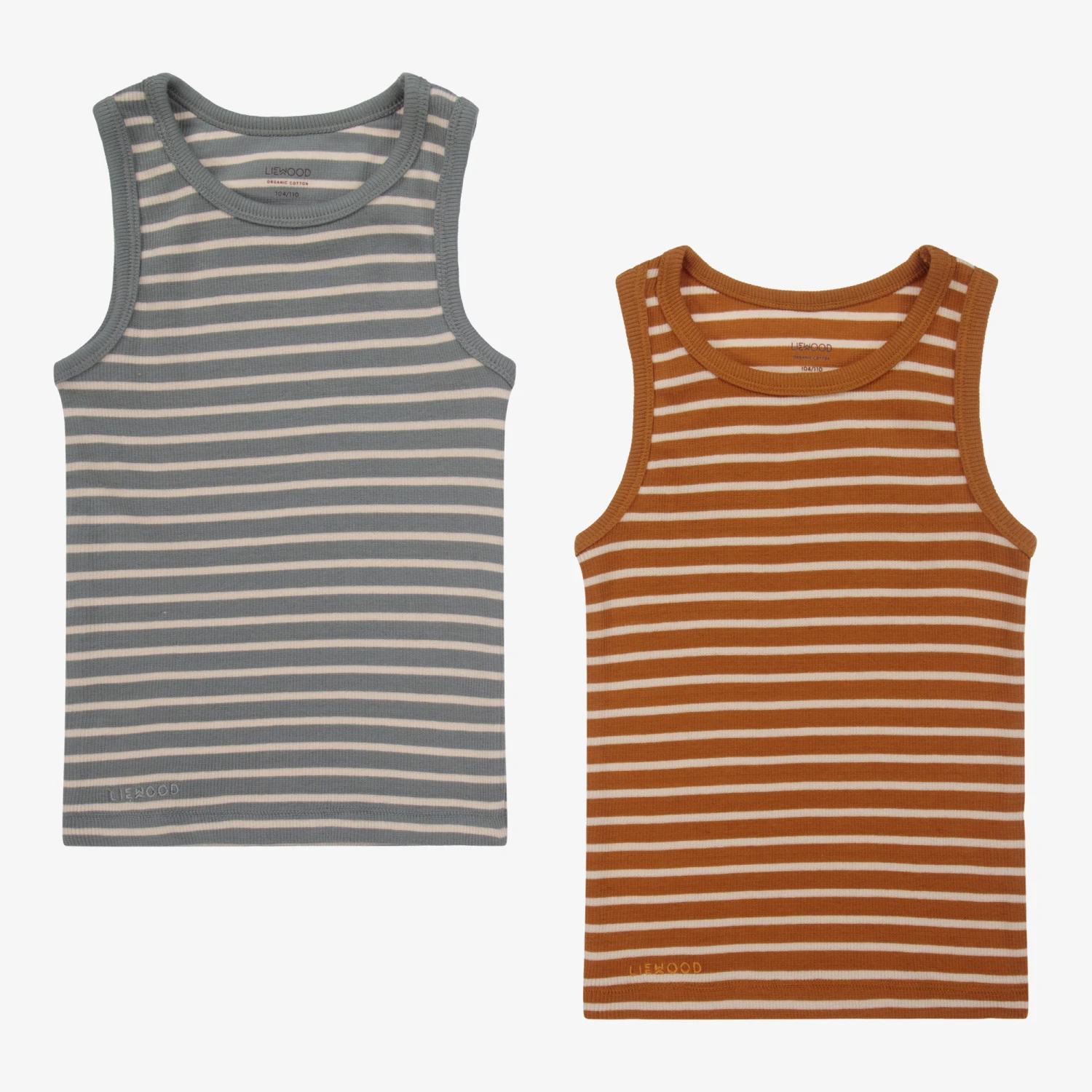 Girls and boys blue, ivory and yellow striped vest tops by Liewood, made in ribbed organic cotton jersey. They have the designer’s name in tone-on-tone embroidery on the front.