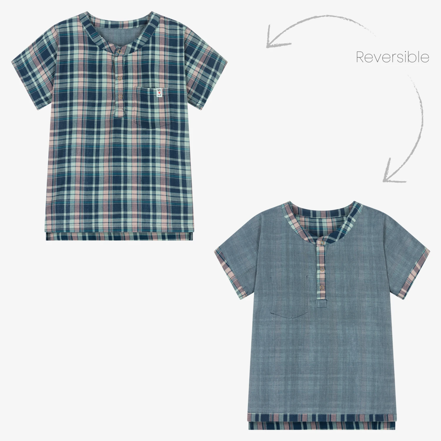A reversible blue tunic shirt for boys and girls by Lilly and Sid, made from lightweight organic cotton. Stylish yet functional, this relaxed top has a checked pattern with a pocket on one side and a plain blue reverse. In a collarless design, there are popper fastenings on the chest and a longer split hem.