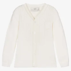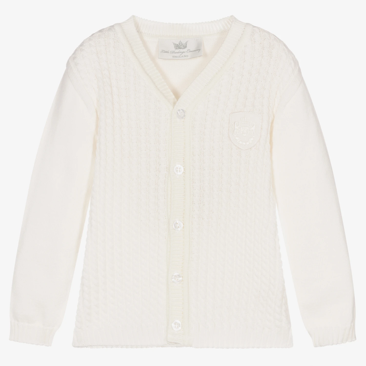 Ivory V-neck cardigan for little boys and girls, from Little Darlings. Knitted in soft cotton, it has cable patterning on the front and an embroidered crest badge on the chest.
