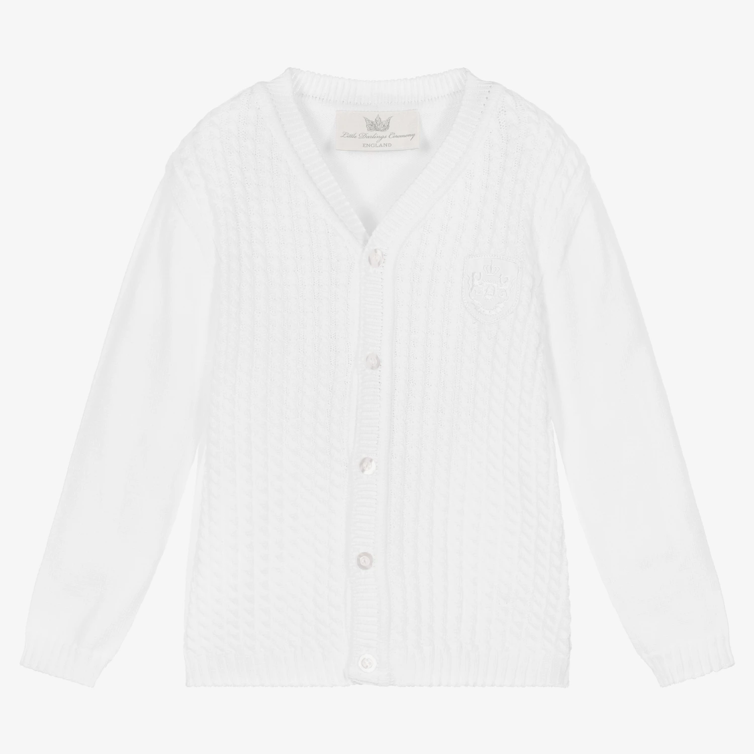 White V-neck cardigan for little boys and girls, from Little Darlings. Knitted in soft cotton, it has cable patterning on the front and an embroidered crest badge on the chest.