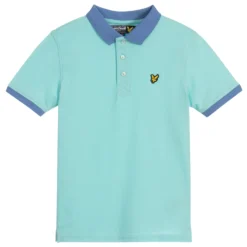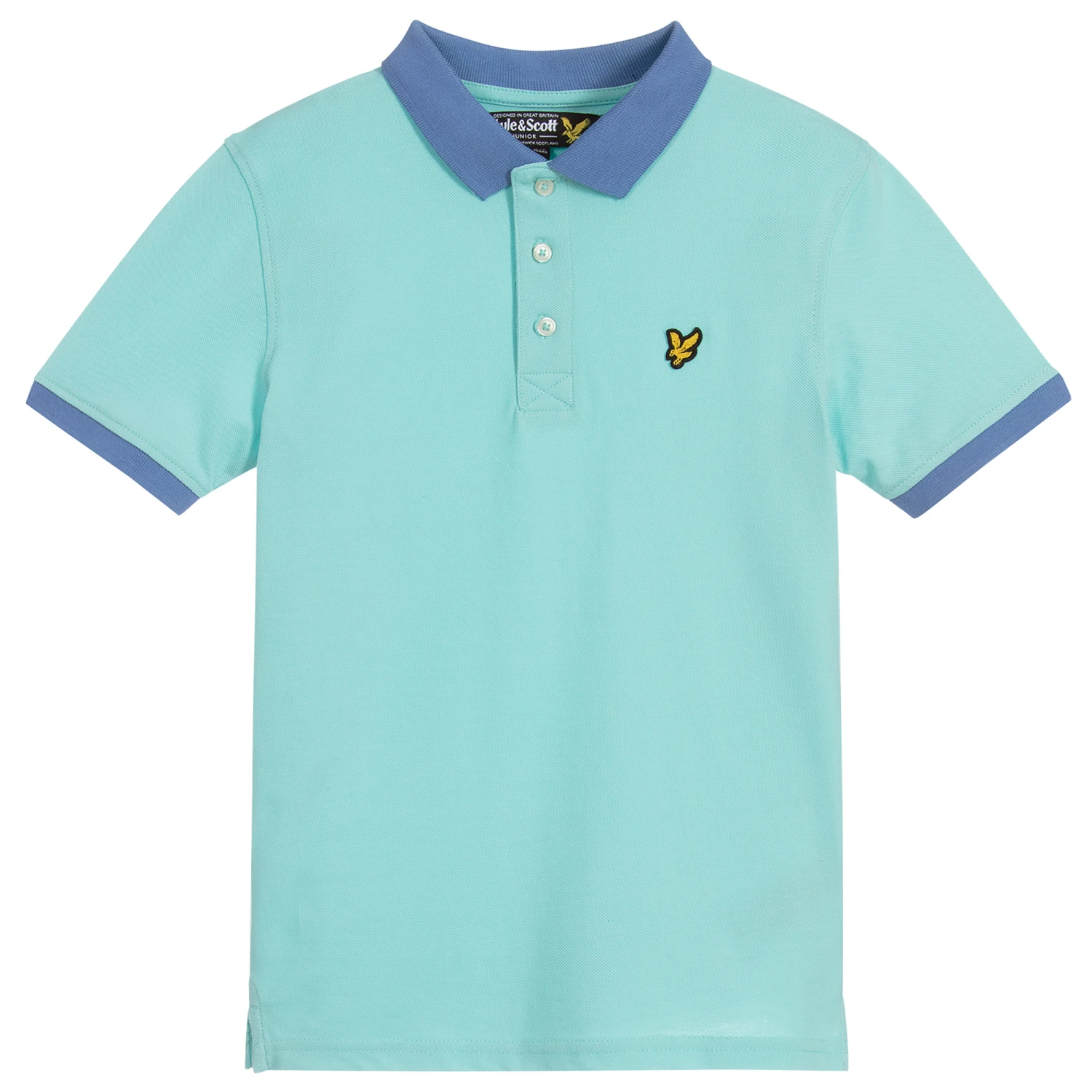 Boys turquoise blue polo shirt by Lyle & Scott, made in a soft cotton piqué. It has cobalt blue ribbed trims, with the designer’s iconic golden eagle logo appliqué on the chest.