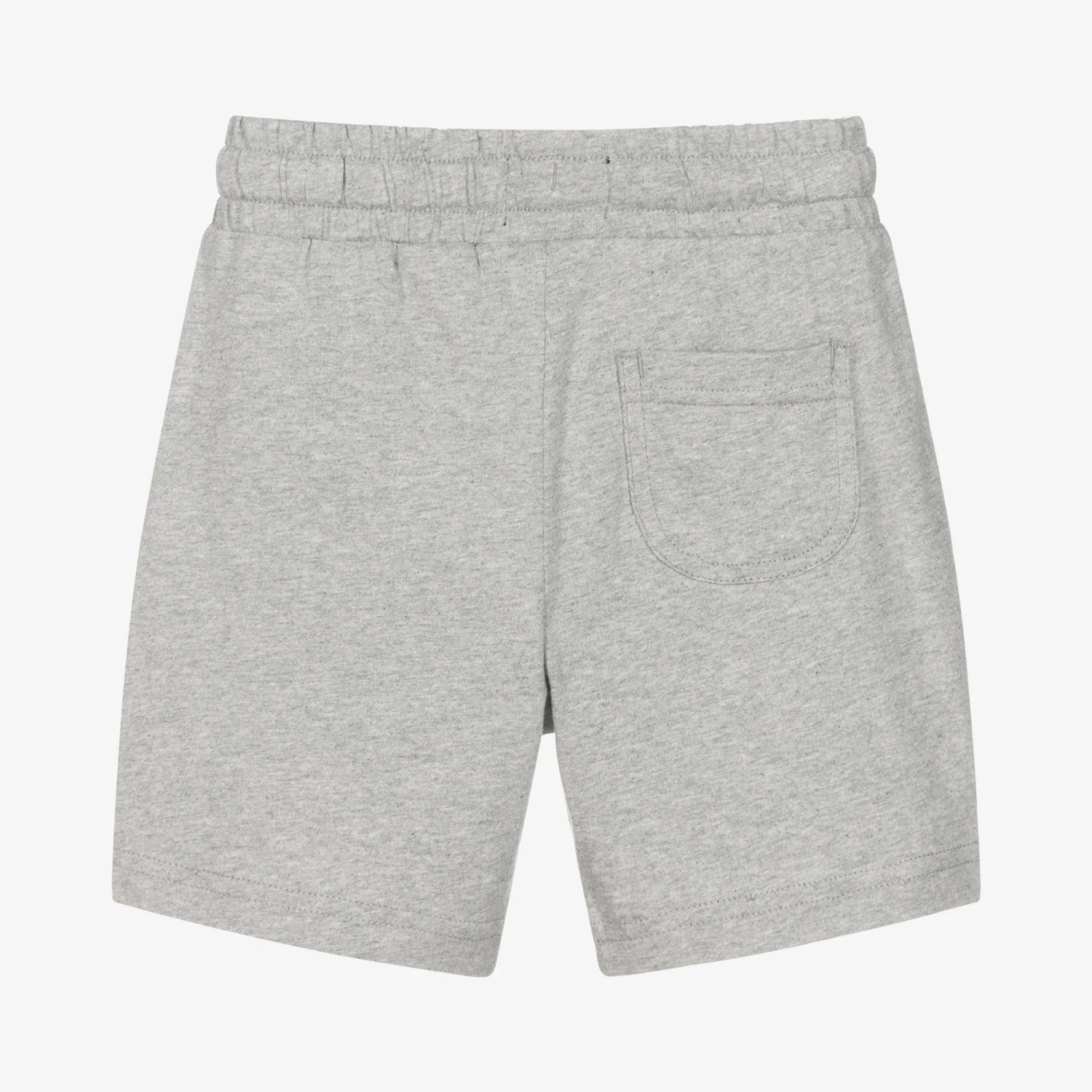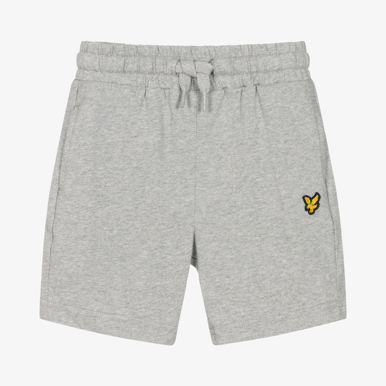 Casual grey marl shorts for boys by Lyle & Scott, made in soft and comfy cotton jersey. They have a gently elasticated waist, with drawstring ties for an adjustable fit. There are side seam pockets, a single back pocket, and a signature embroidered Eagle logo on one leg.