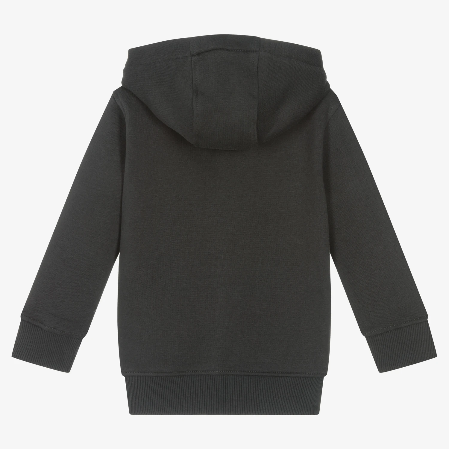 A dark grey zip-up hoodie for boys by Lyle & Scott, made from soft cotton jersey. Comfy for layering, it has pouch pockets on the front, with ribbed trims and a fleecy underside. A signature Golden Eagle logo is patched onto the front for a branded look.