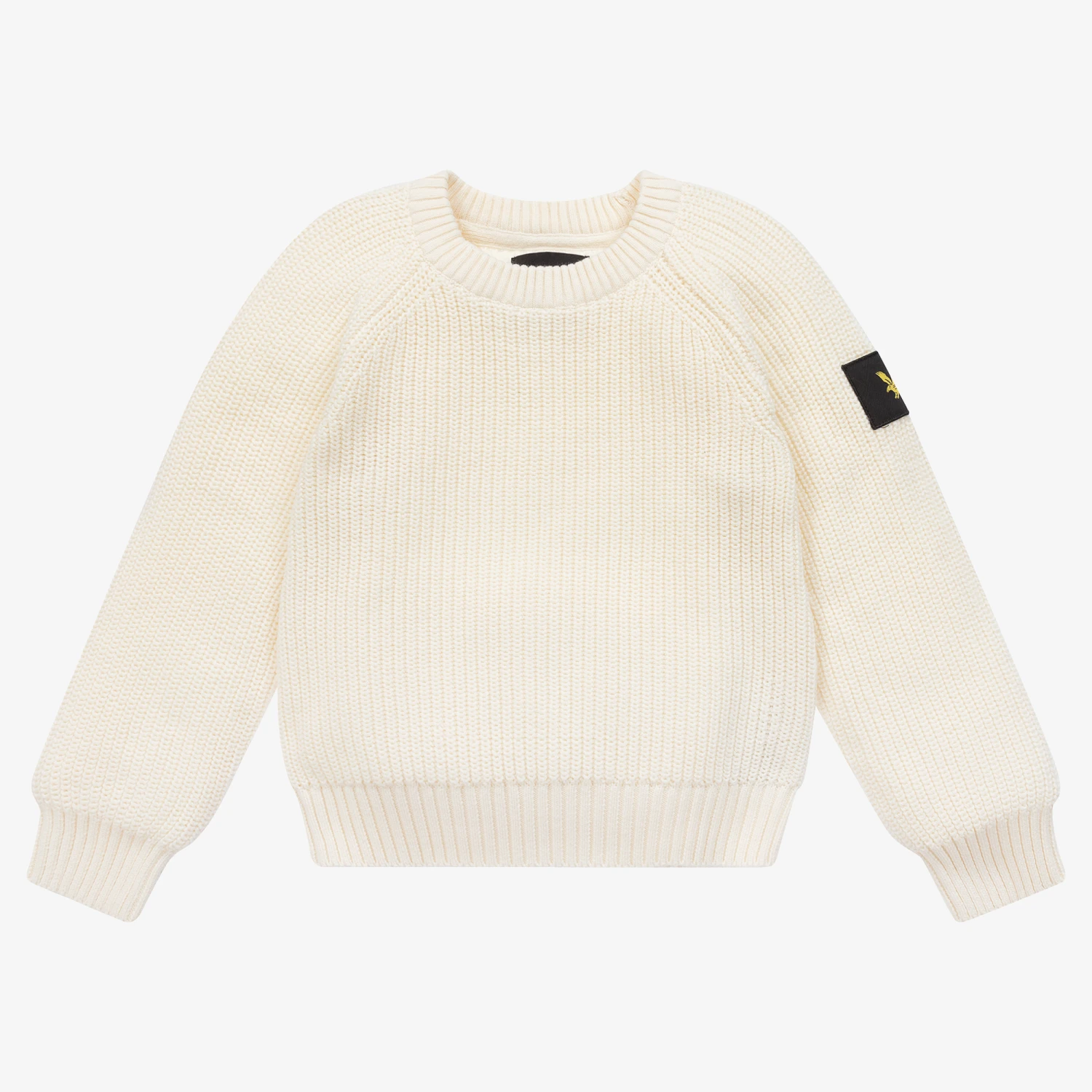 Ivory sweater for boys by Lyle & Scott, made in a soft cotton rib knit. Part of the Vintage collection, it has the brand’s signature golden Eagle logo on a black patch on one sleeve.