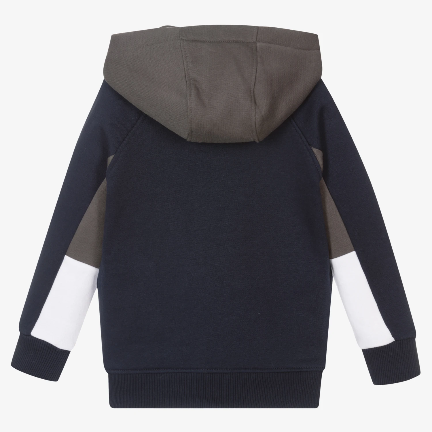 A navy blue zip-up hoodie for boys by Lyle & Scott, made from soft cotton jersey. In a cool colourblock design, this top has a grey hood, with white and grey trims on the sleeves. The brand’s signature Golden Eagle is patched on the front to finish off this casual layering piece.