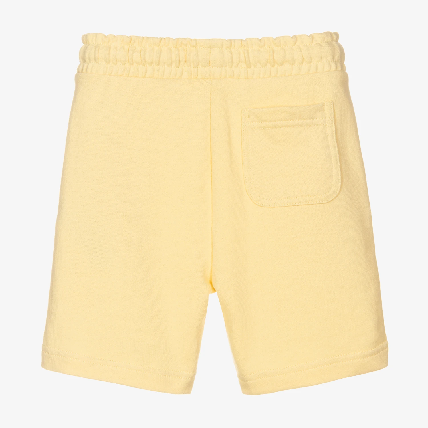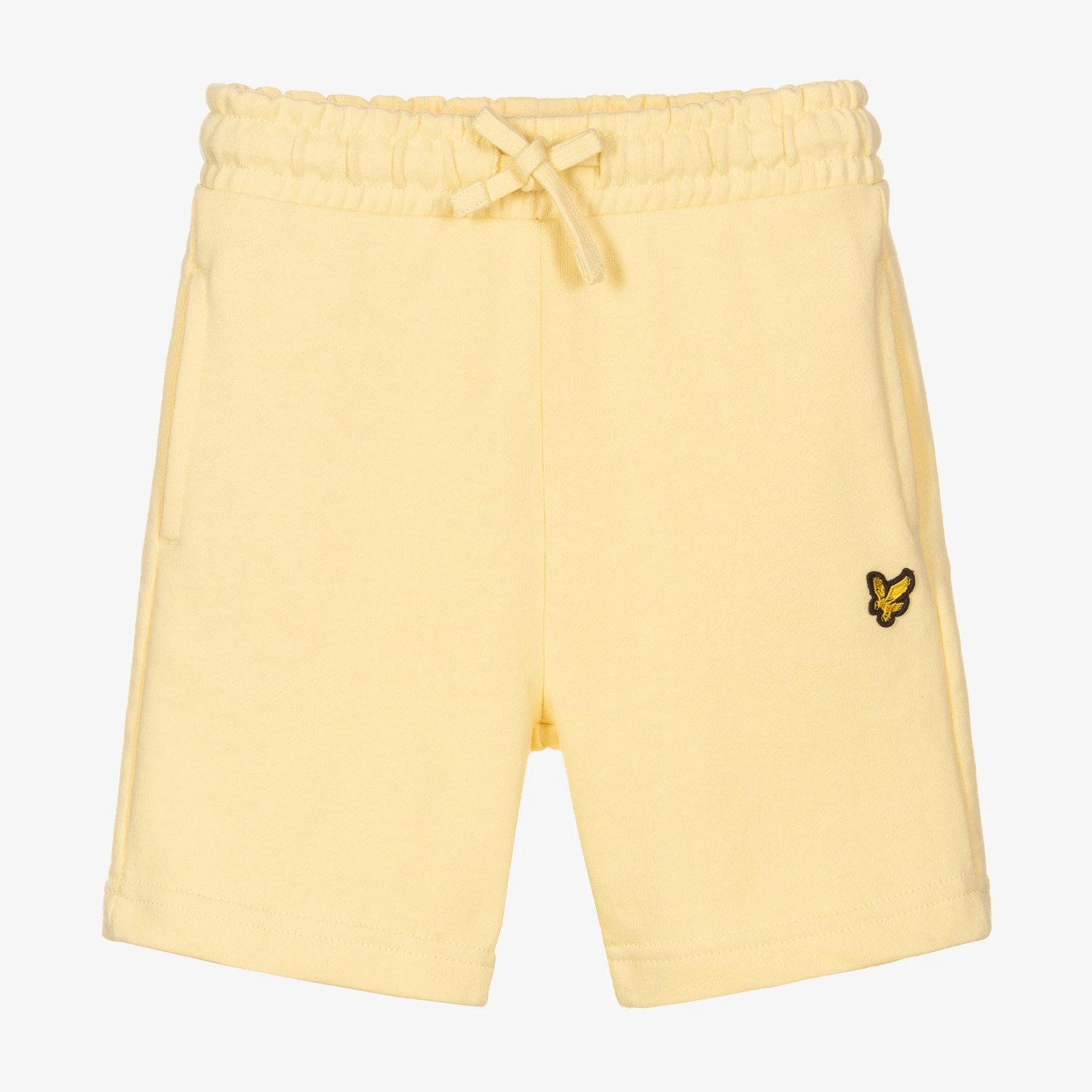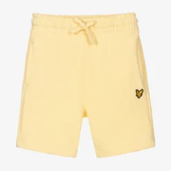 Pale yellow shorts for boys by Lyle & Scott, made in soft cotton jersey. They have an elasticated drawstring waist and side seam pockets. The brand’s iconic Eagle logo is appliquéd on one side.