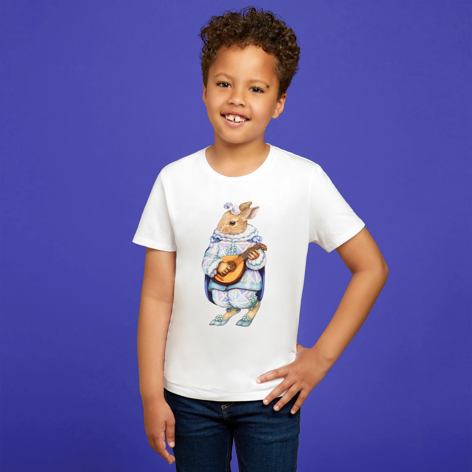 White short-sleeve T-shirt in soft stretch cotton with an adorable harlequin rabbit print.
