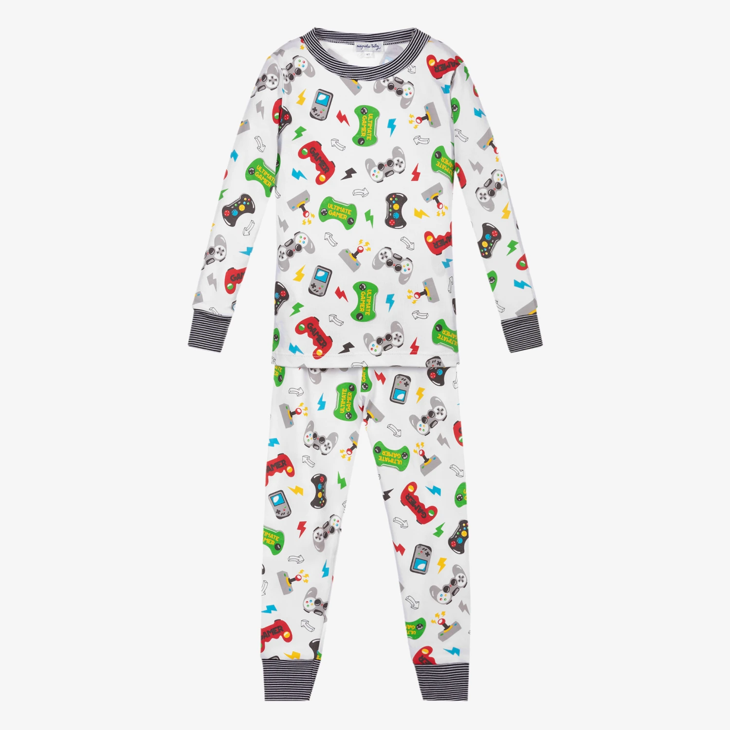 White long pyjamas for boys by Magnolia Baby, made in super soft and stretchy Pima cotton jersey. They have a colourful games console print and black and white striped trims.