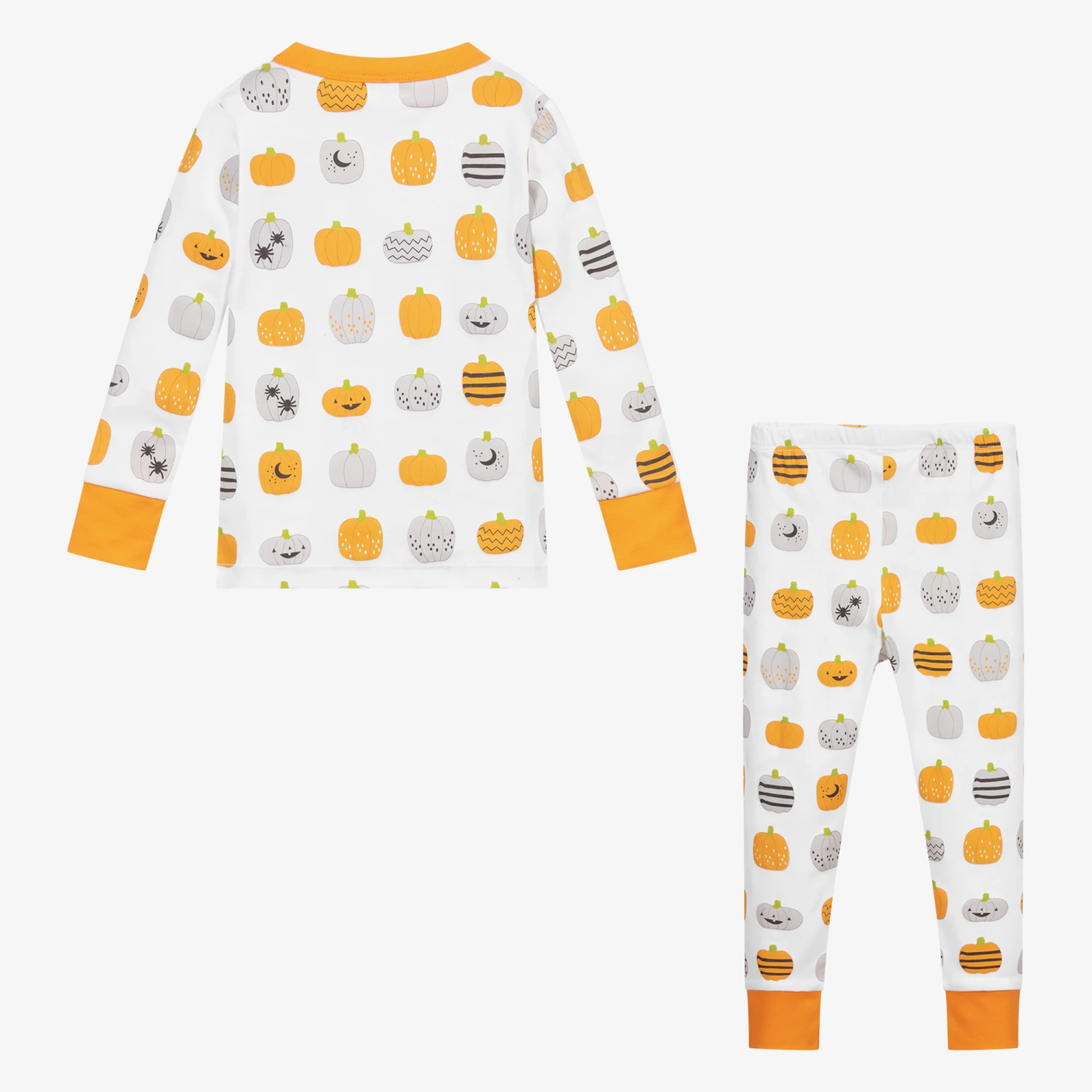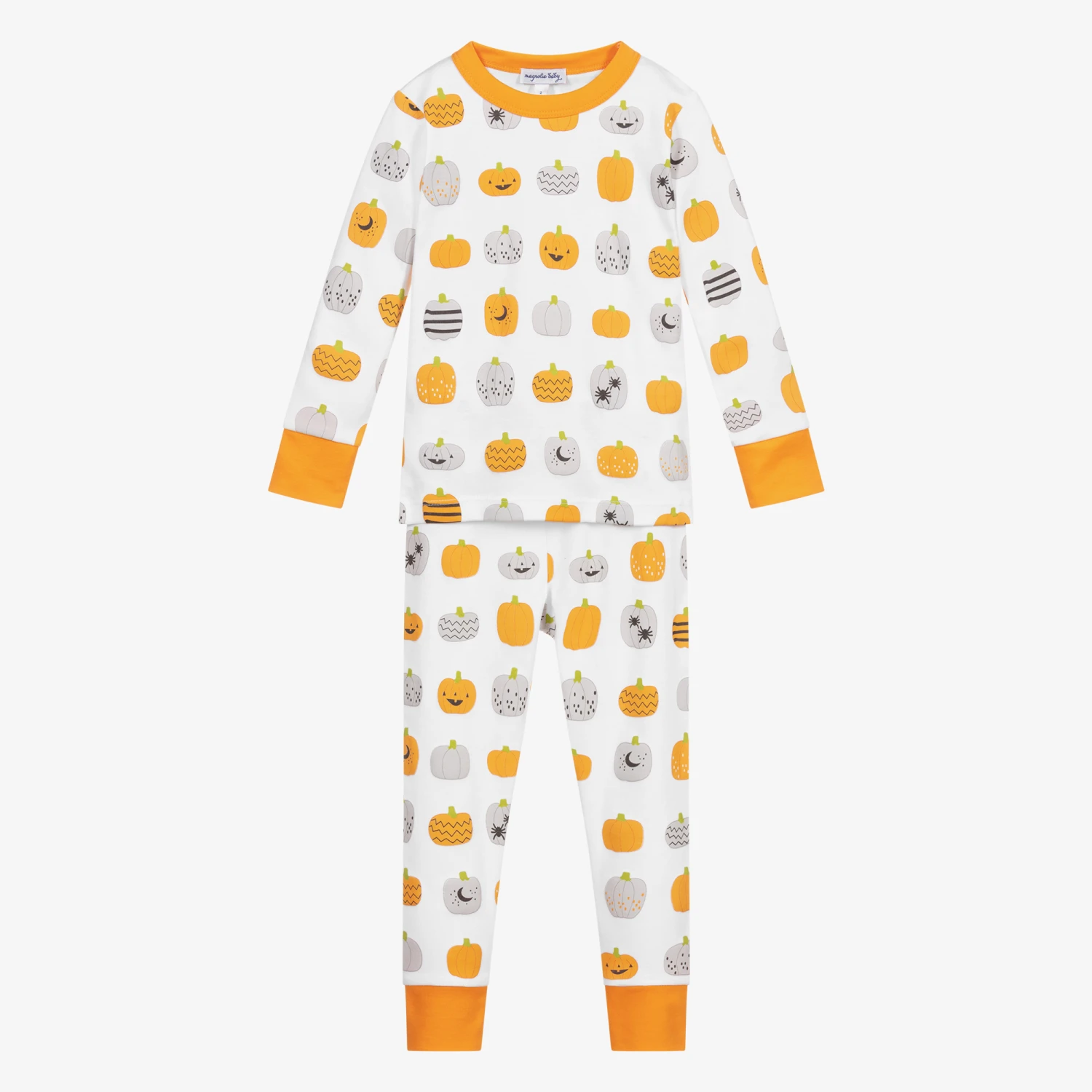White long pyjamas for boys and girls by Magnolia Baby, made in super soft and stretchy Pima cotton jersey. They have a fun grey and orange pumpkin print and orange trims.