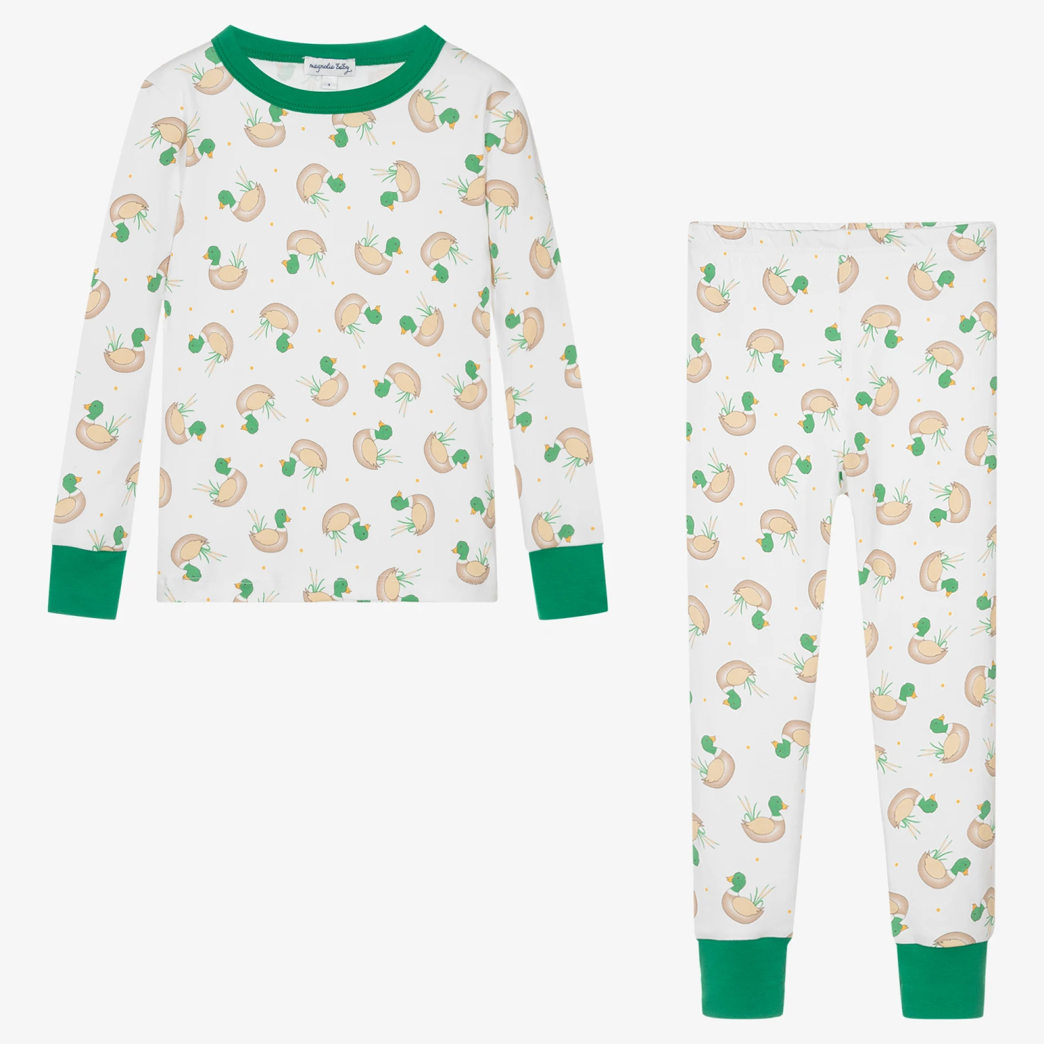 Sweet white and green pyjamas for boys and girls, by Magnolia Baby. Made in beautifully soft Pima cotton jersey, they have a cute duck print all-over and green contrasting trims.