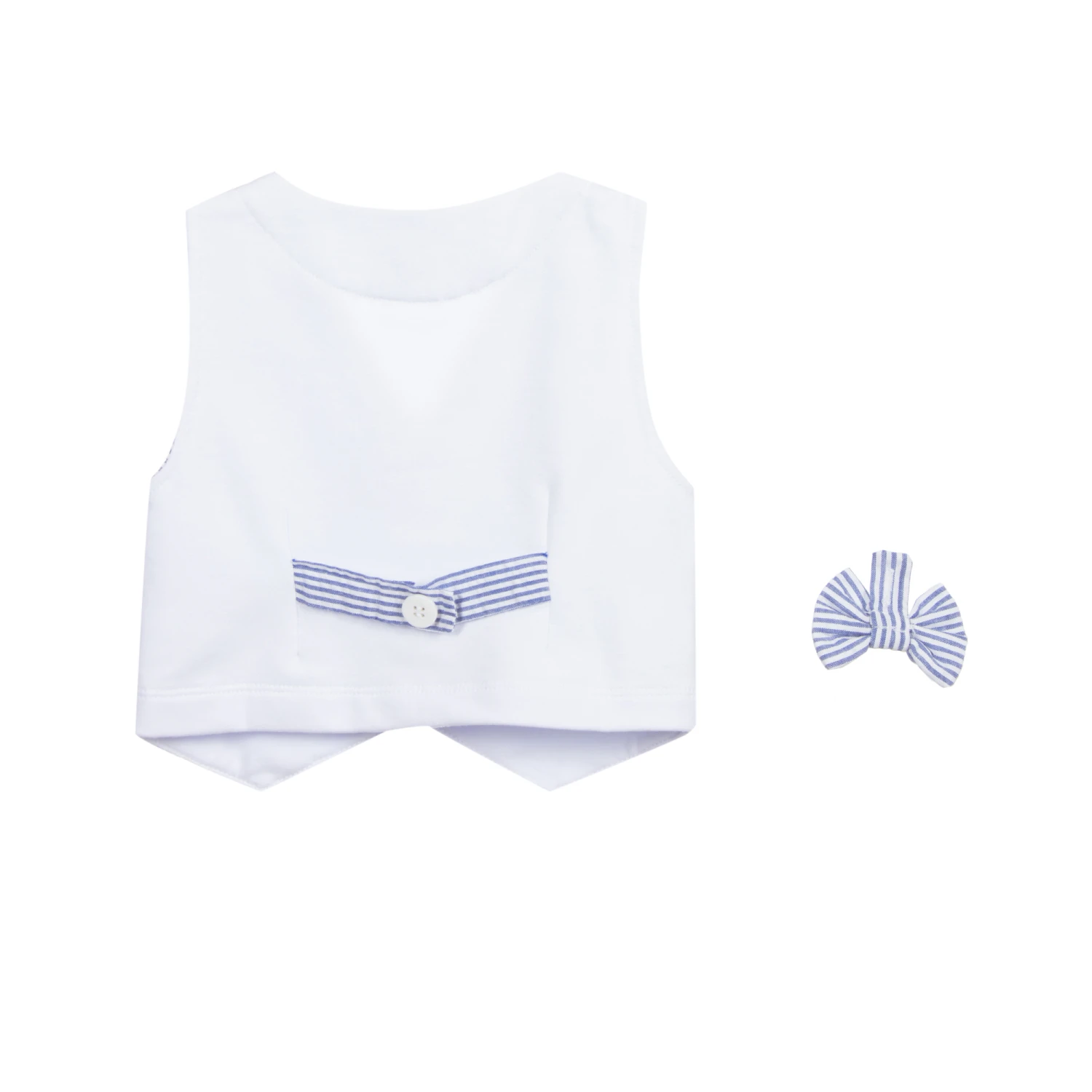 Boys blue and white striped cotton seersucker waistcoat and bow tie set by Malvi & Co. It has a white cotton jersey back and lining on the front, with a striped back strap and button detail. There are faux pockets on the front. The matching bow tie has a button hole to attach to a shirt.