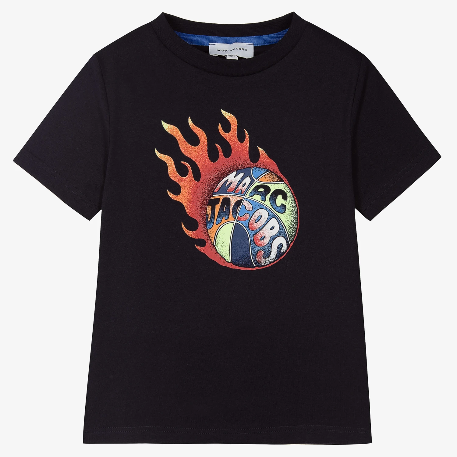 A dark blue T-shirt for boys by American brand MARC JACOBS, made in super soft and comfortable organic cotton jersey. It has a colourful logo basketball with flames printed on the front for a sporty, innovative style.