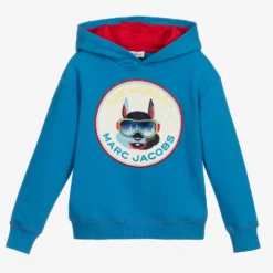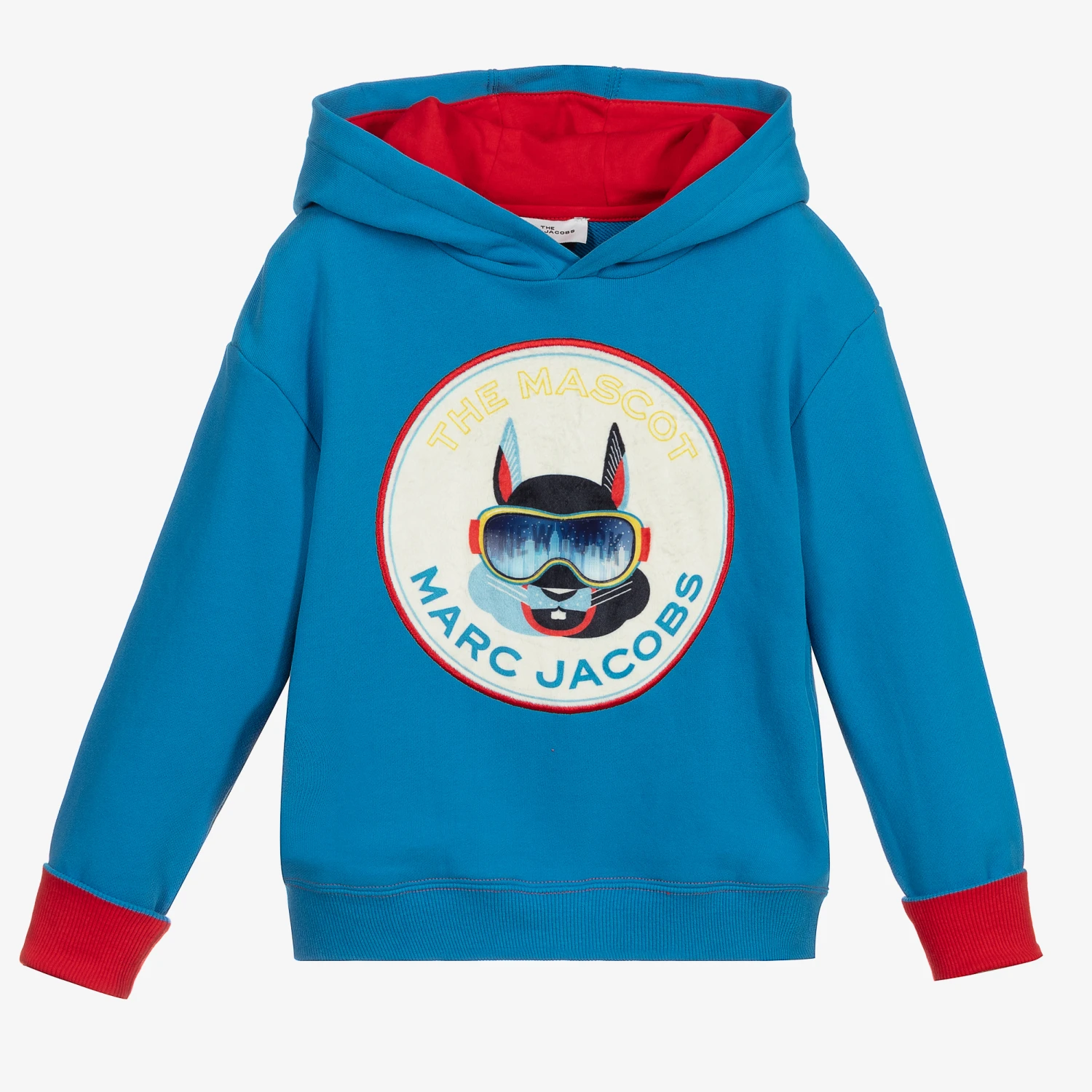 Boys bright blue hooded sweatshirt by THE MARC JACOBS. It is made in a mid-weight cotton jersey with a red jersey-lined hood and side seam pockets. The front has an ivory soft faux fur appliqué, with The Mascot in a colourful print, wearing New York themed holographic ski goggles.