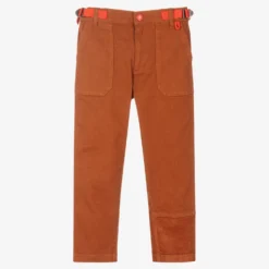 Boys brown cotton twill trousers by MARC JACOBS. In a utility style, they have deep side slant pockets and two corduroy pockets on the back with popper closure and logo embroidery on the ‘tool’ pocket. They have waist adjusters at the sides. They fasten with a popper and zip and have useful belt loops.
