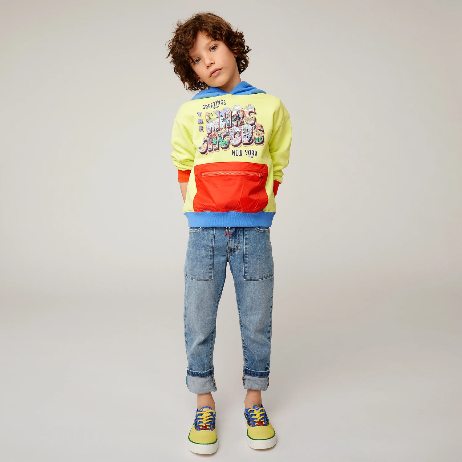 Light blue wash denim jeans for boys by THE MARC JACOBS, in a tapered slim fit. Soft, with slight stretch they have a drawstring waist, as well as a zip and popper fastening. There are five pockets and cool dog prints on the back pockets.