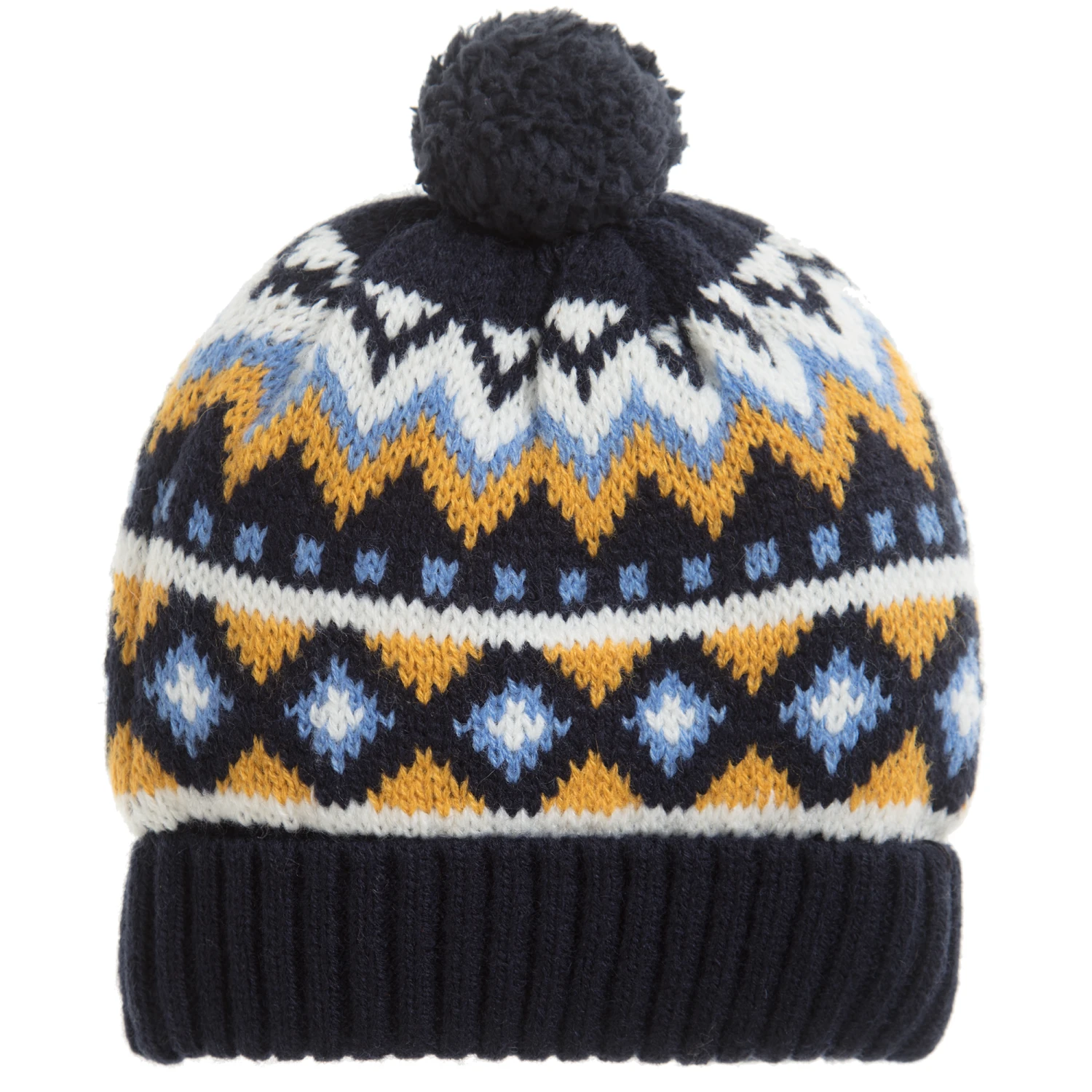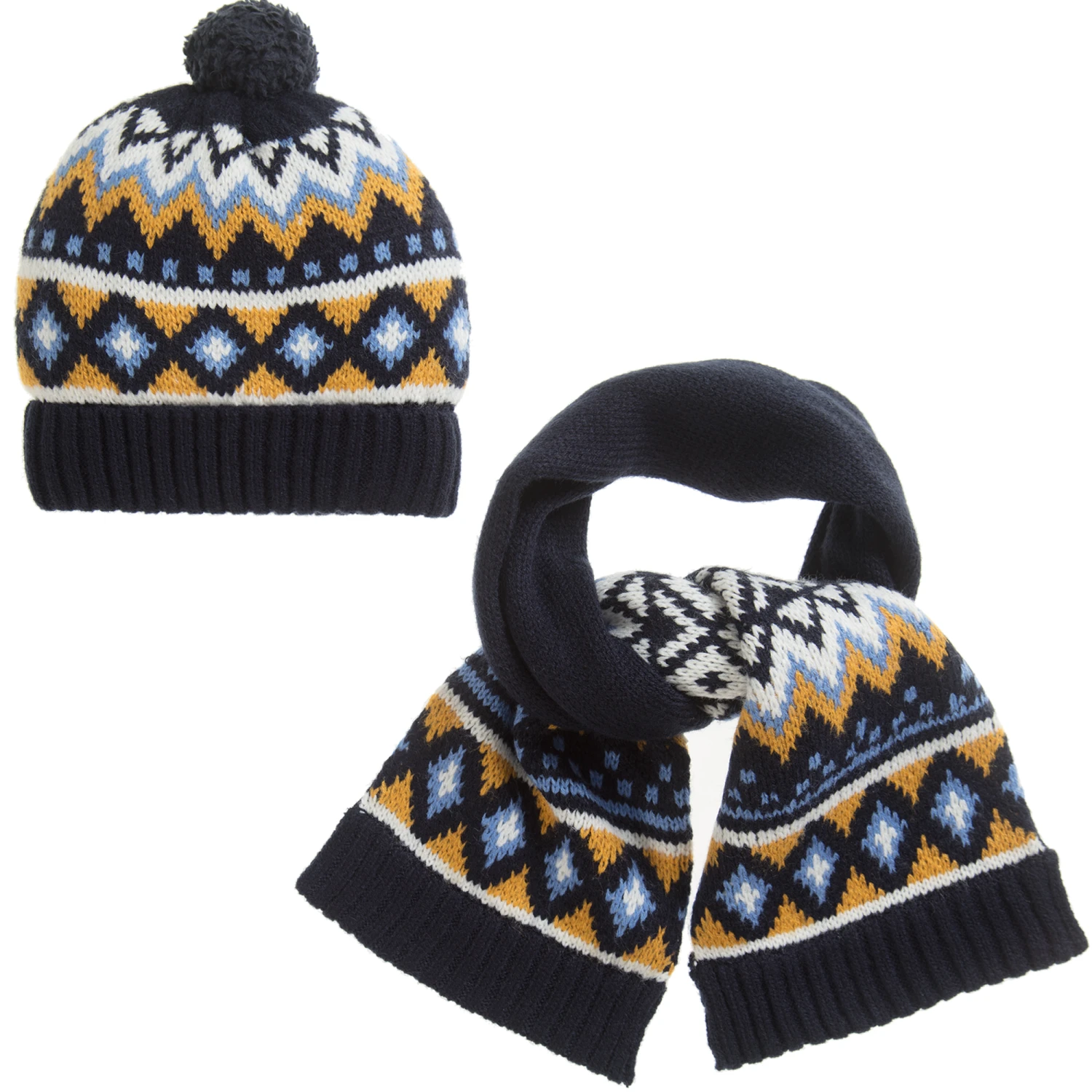 Keep little boys all cosy and warm when cooler days set in, with this wool blend hat and scarf set by Mayoral. In a classic style, both hat and scarf are navy blue with a mustard yellow, blue and white Fair Isle inspired pattern and there is a cute blue pom-pom on top of the hat. Let the cold winds blow!