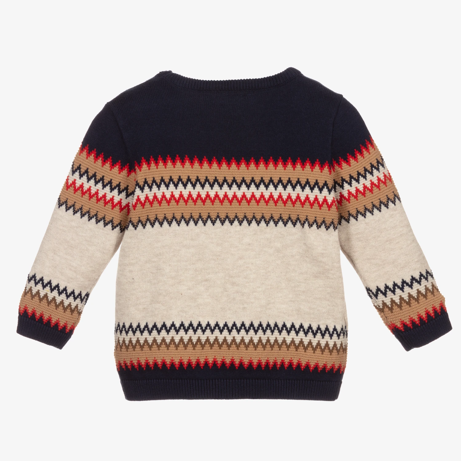 Navy blue, beige and red sweater for little boys by Mayoral. It is knitted in soft organic cotton, with button fastenings on one shoulder.