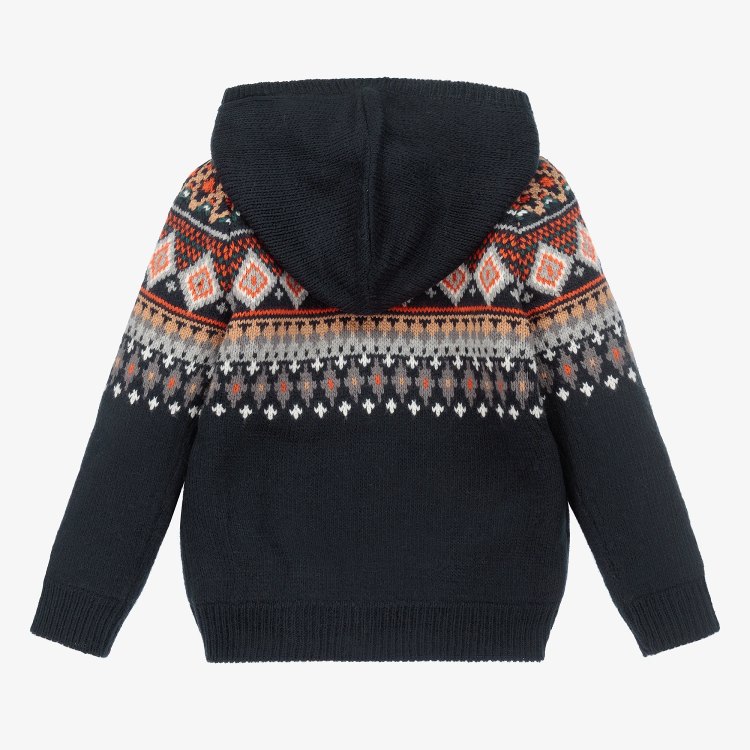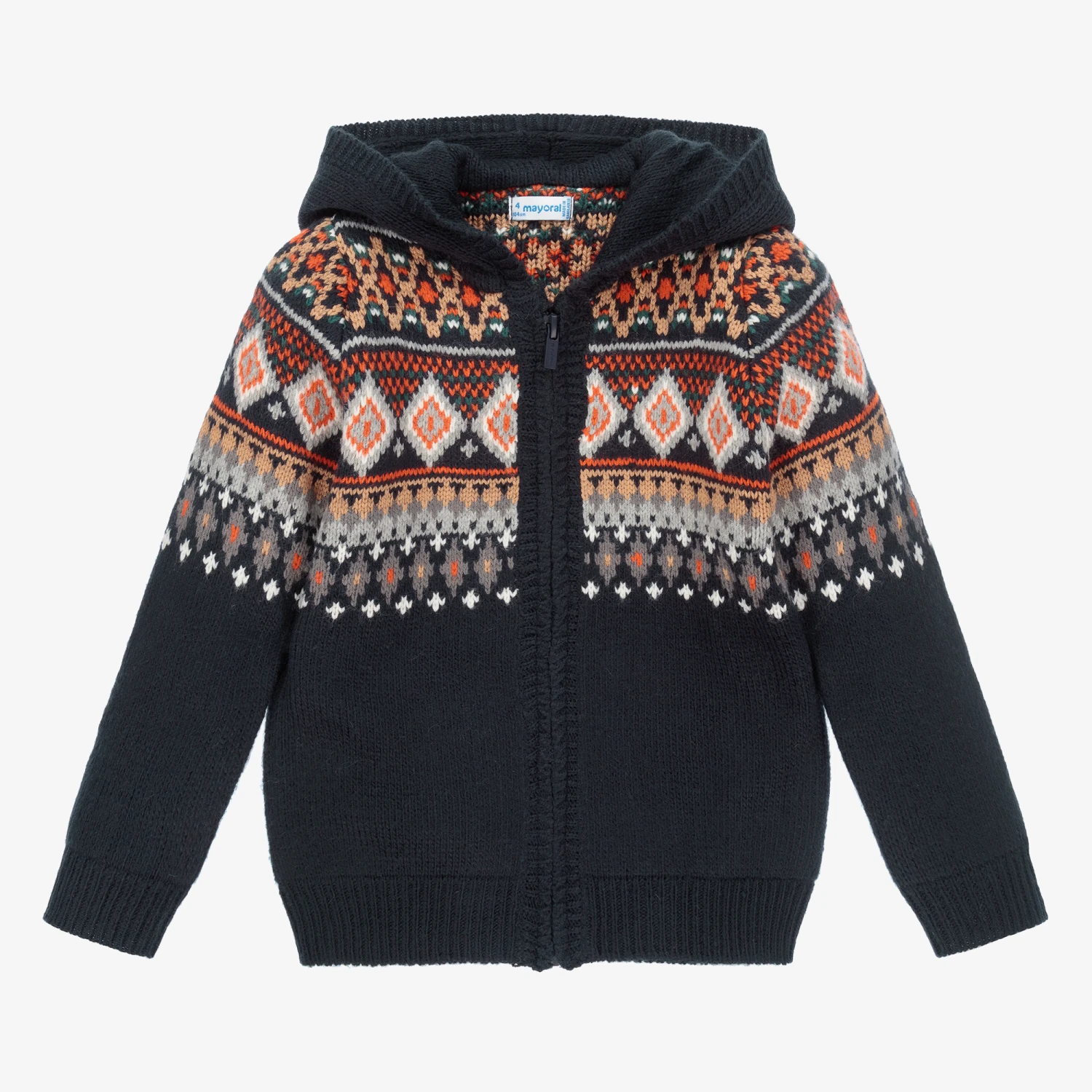 Boys navy blue hooded zip-up cardigan from Mayoral, in a double-layered acrylic knit. It has an eye-catching Fair Isle pattern in grey, orange, beige and white on the front and back.