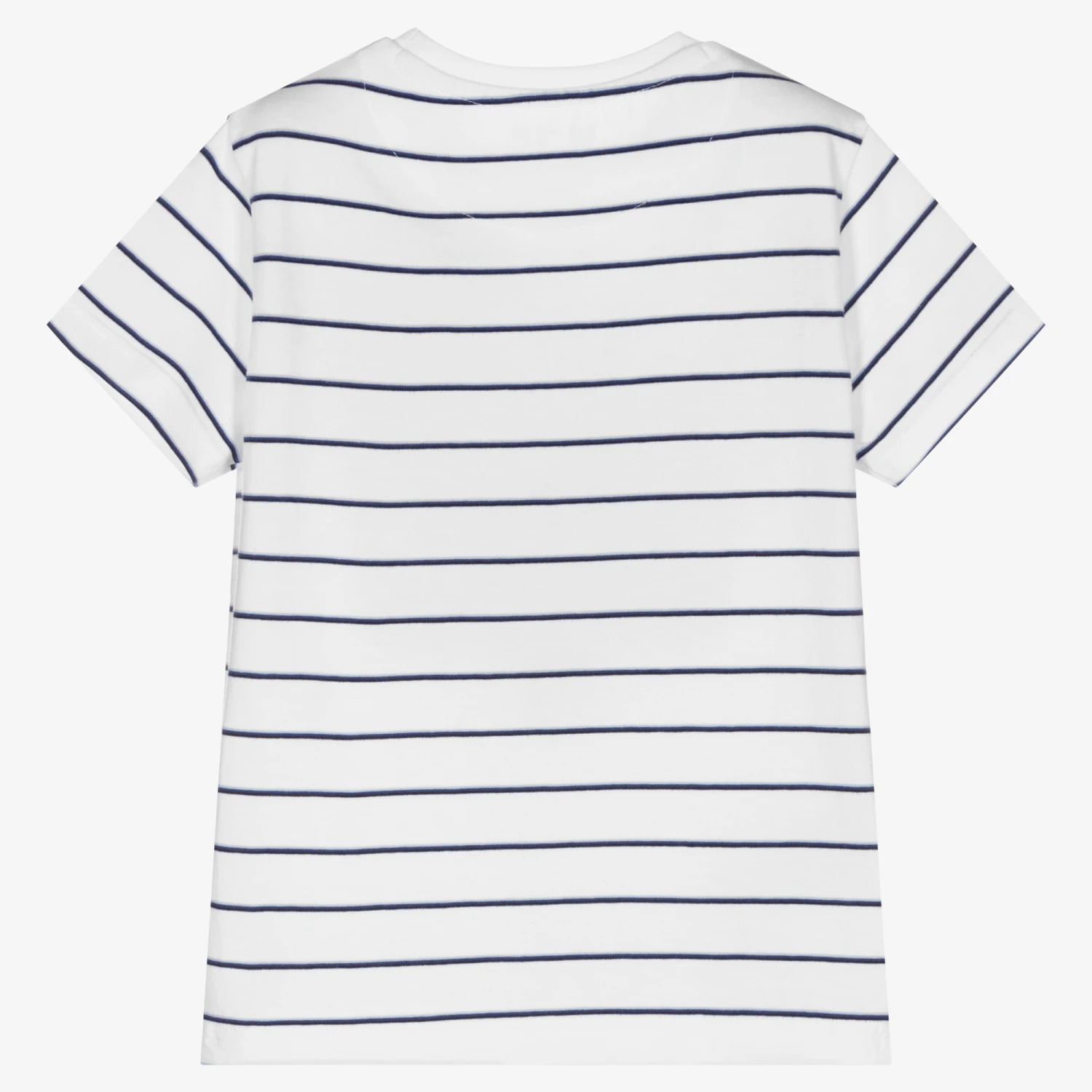 White and blue striped T-shirt for boys by Mayoral, made in comfortable, sustainable cotton jersey. On the front are two appliqués and a chest pocket, all printed with a blue motorcycle.