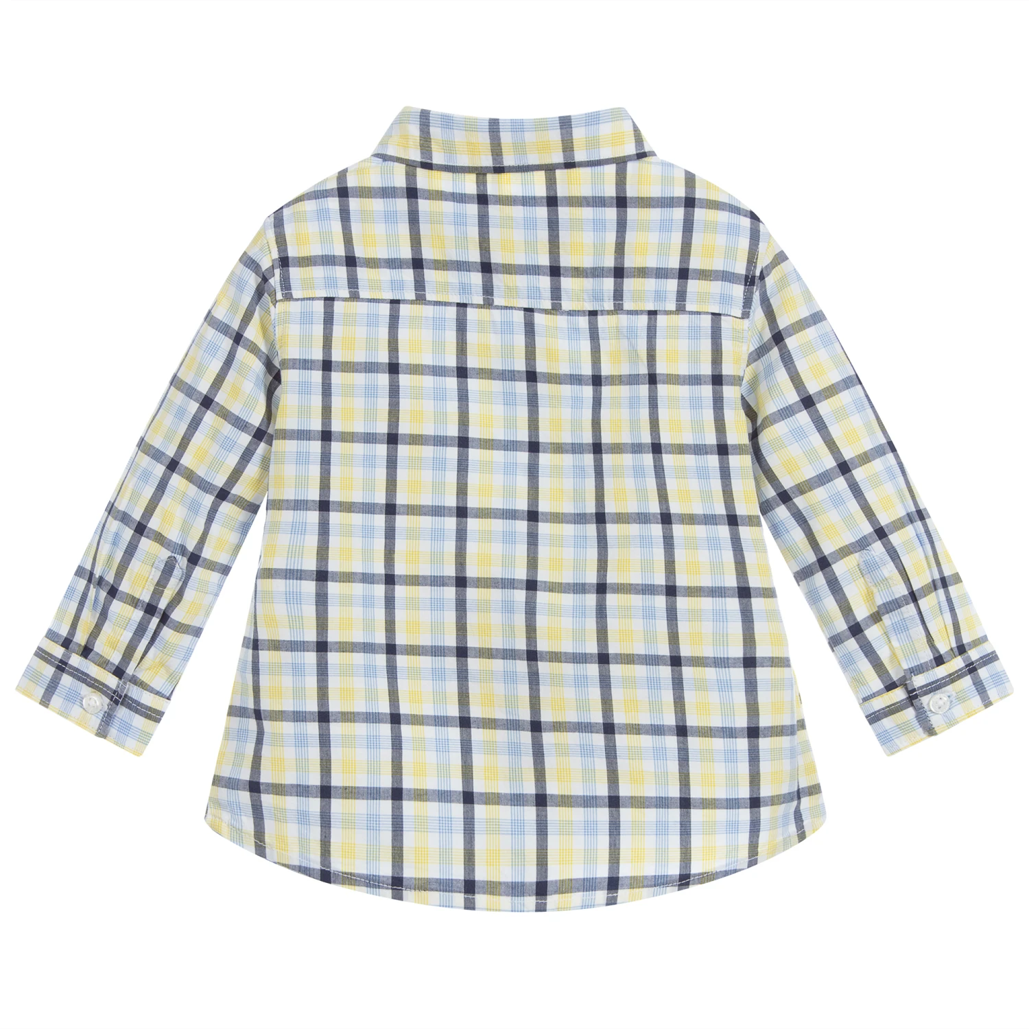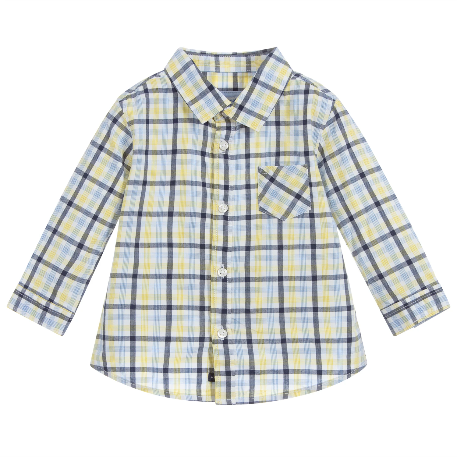 Smart-casual shirt for little boys by Mayoral, with a blue, yellow and white check pattern. Made from soft cotton, it has a chest pocket and fastens with buttons on the front.