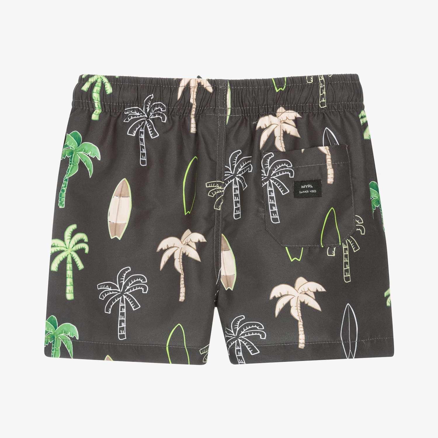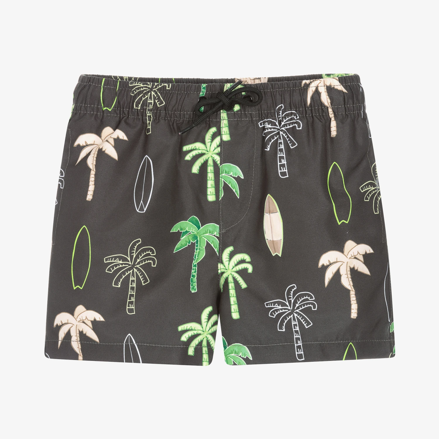 Fun black swim shorts for boys by Spanish brand Mayoral, with a green palm tree and beige surf board pattern. Made in silky smooth, soft recycled fibres, they have an elasticated waistband with a drawstring for a good fit and a mesh lining for comfort. There are useful, concealed pockets on the sides and another pocket around the back.