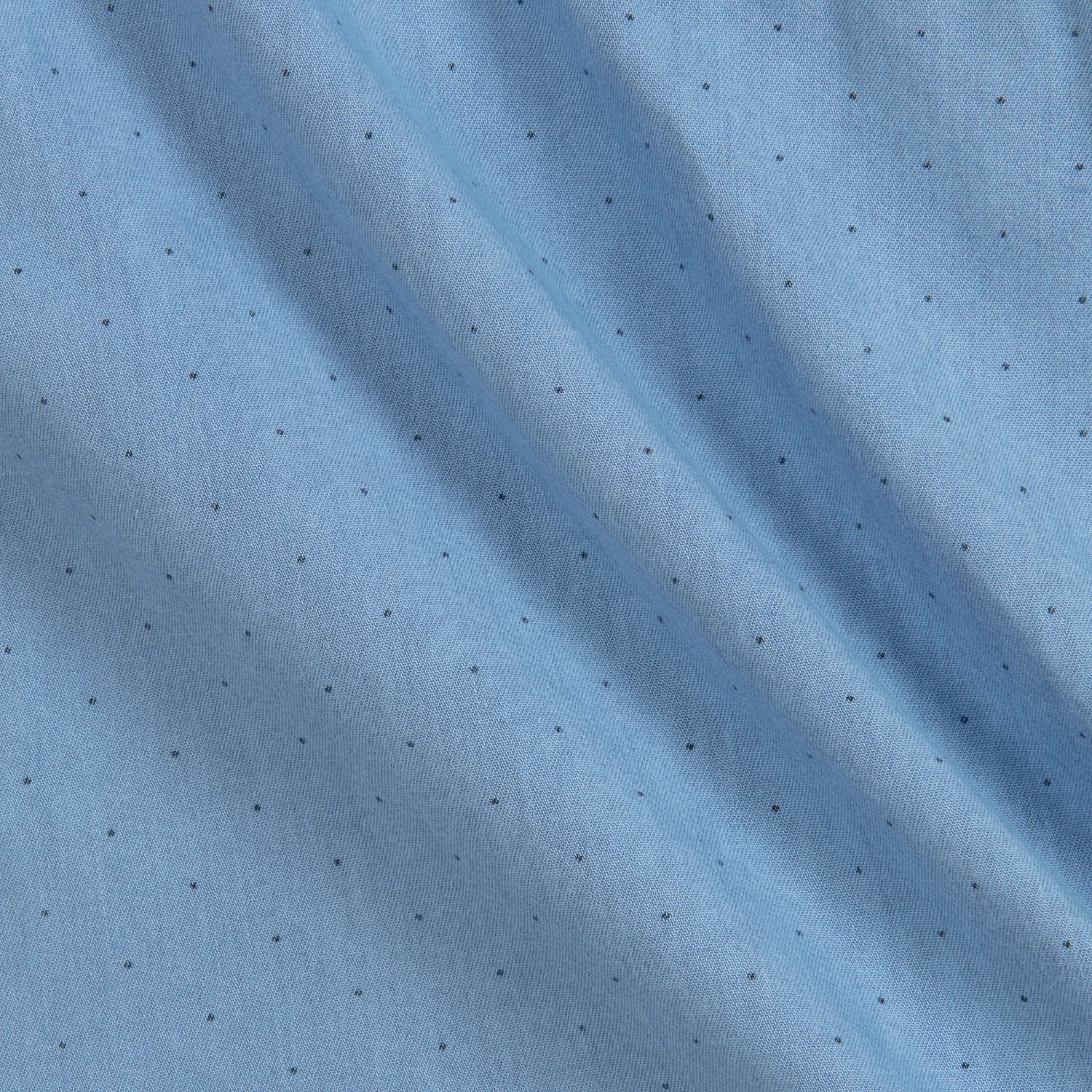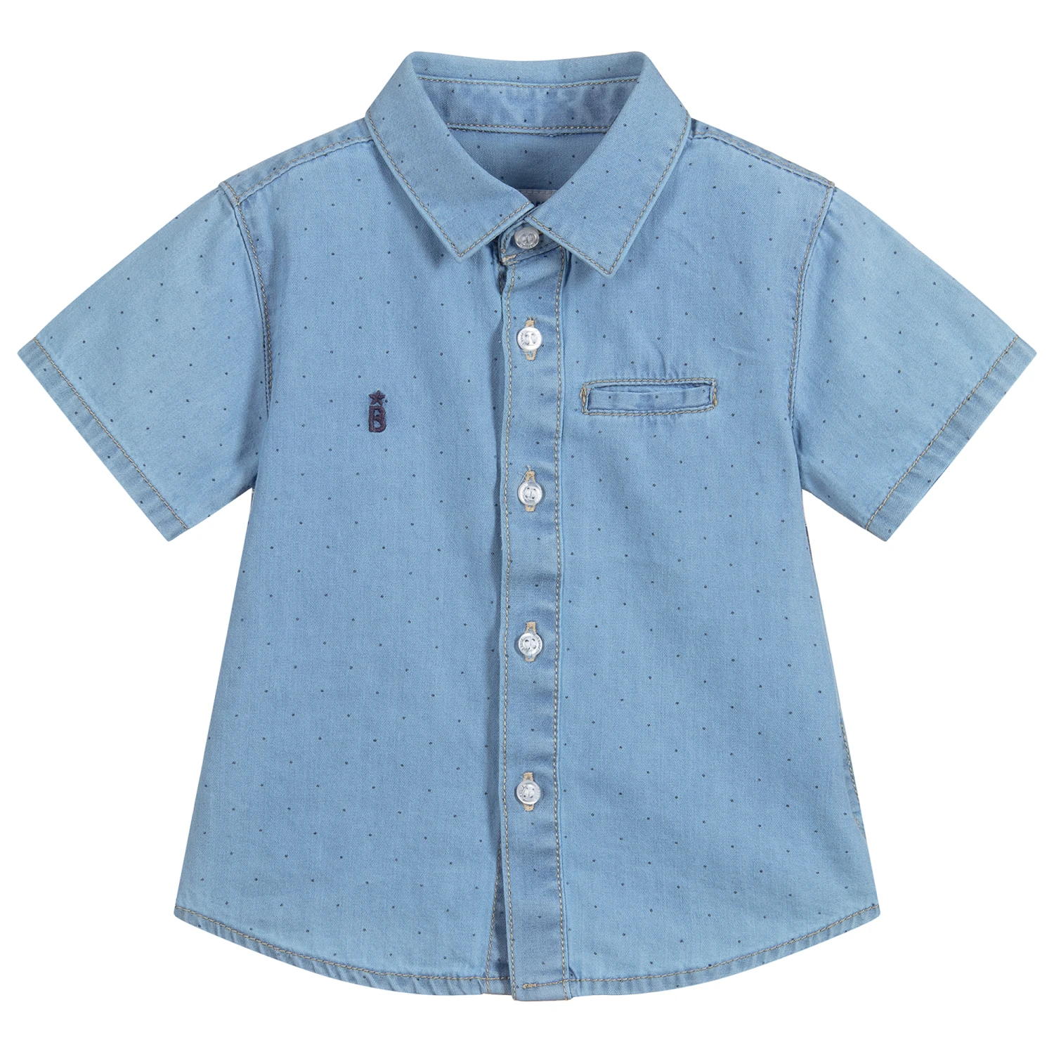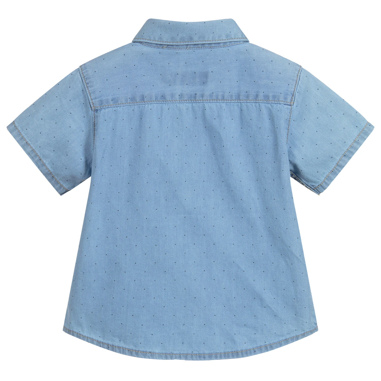 Younger boys soft cotton, light blue chambray shirt by Mayoral. Short-sleeved, it has a dotty print, yellow stitching and a chest pocket.