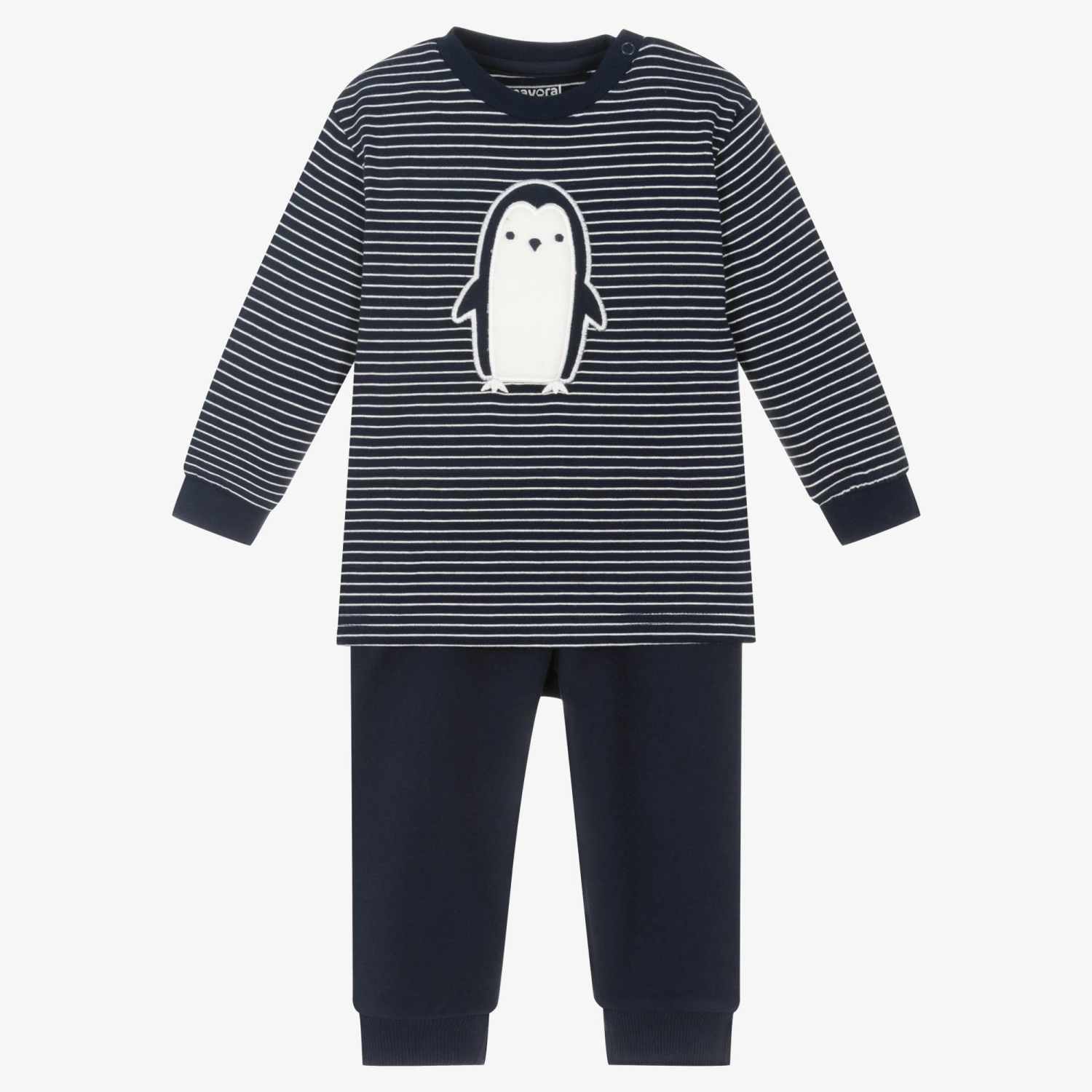 Cosy and comfy long pyjamas for little boys by Mayoral, made in soft cotton jersey. The navy blue and white striped top has a cute penguin appliqué on the front, with popper fastenings on one shoulder. The navy blue trousers have an elasticated waist with a drawstring tie.