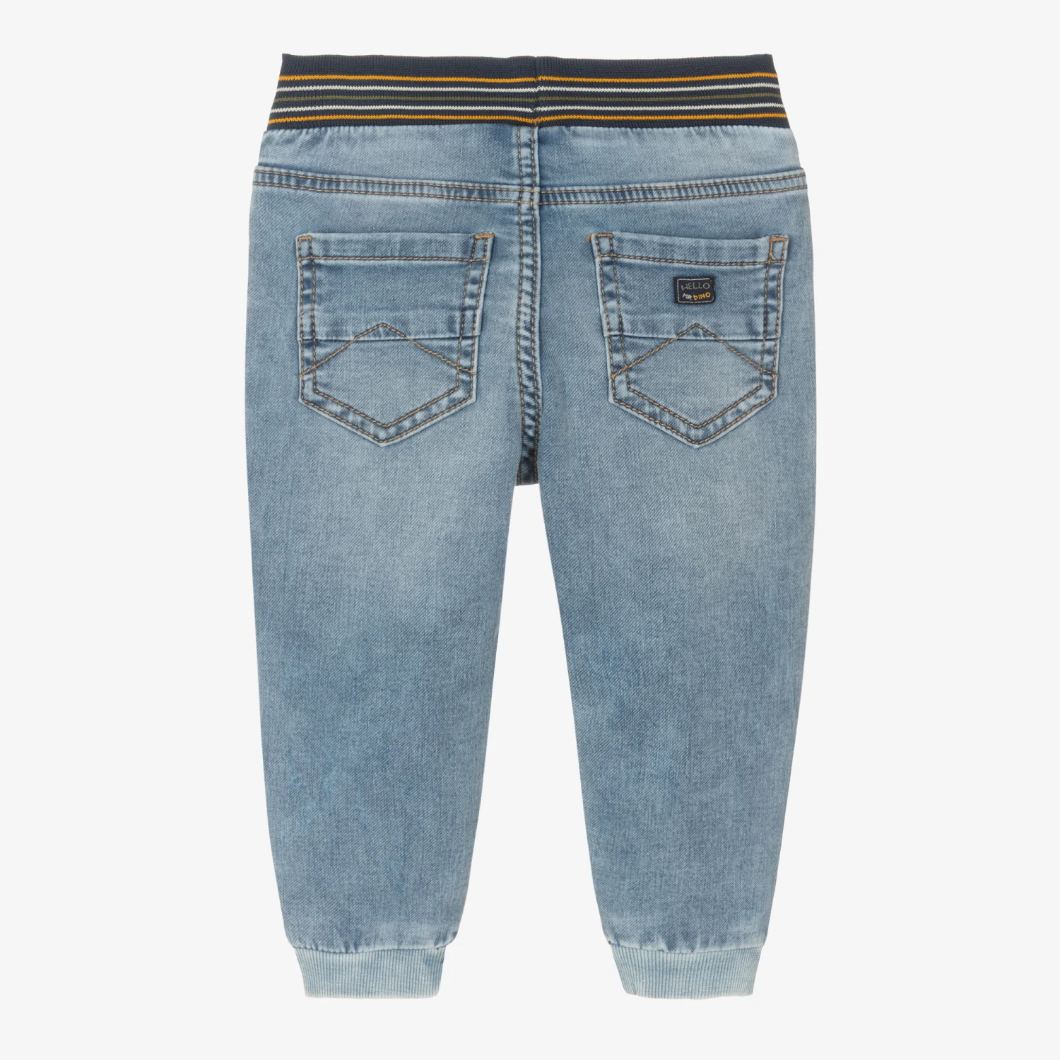 Blue jeans for little boys by Spanish brand Mayoral, with five-pocket styling and a washed and worn look. Ideal for all-day wear, they are made in stretchy sustainable cotton with the look of denim but the feel of jersey. They have a comfortable jogger fit, with an elasticated navy blue waistband, striped in yellow, white and green, a drawstring waist and elasticated cuffs.