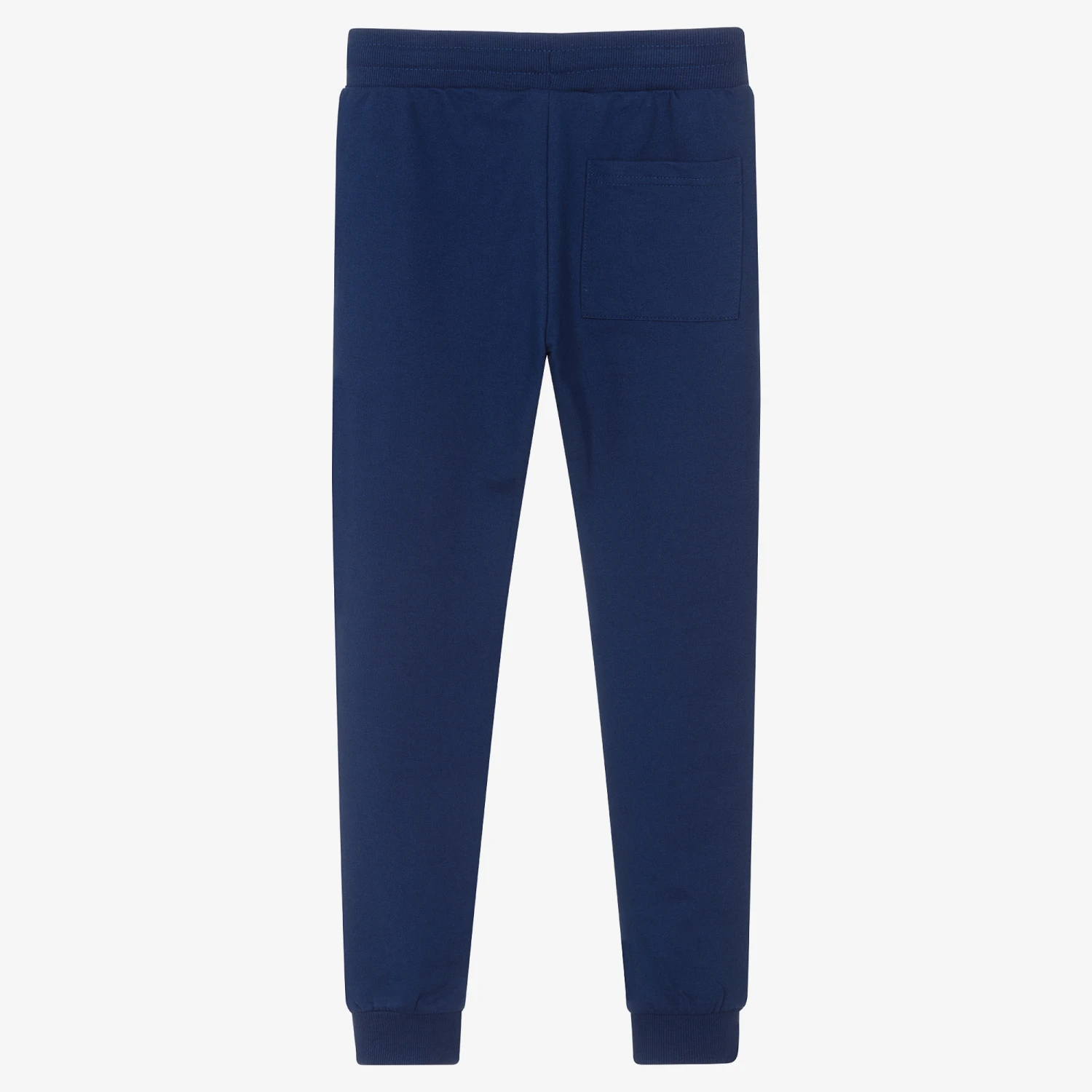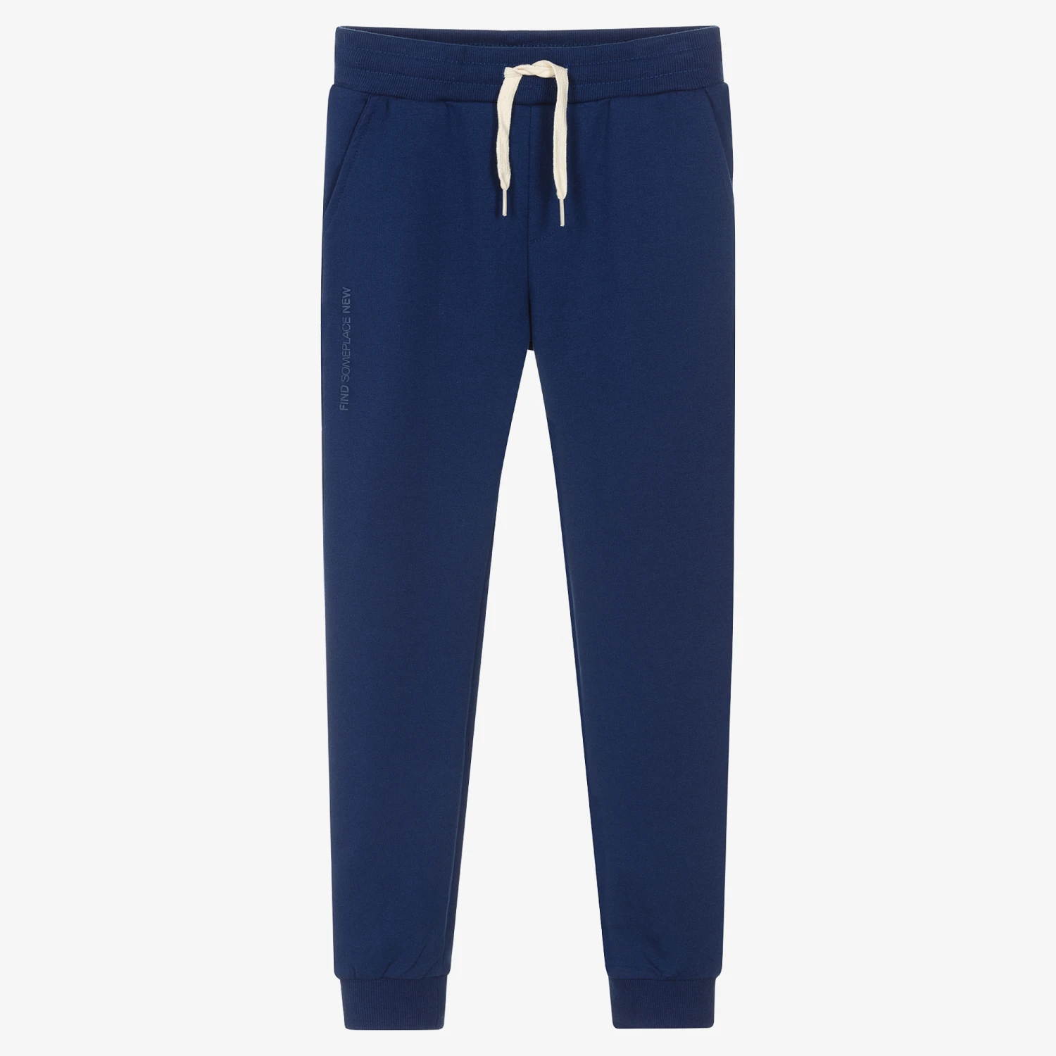 Comfortable blue joggers for boys by Mayoral, made in soft cotton-blend jersey. They have an elasticated waistband with a drawstring tie for an adjustable fit, three pockets and ‘Find some place new’ in raised tonal print on one leg.