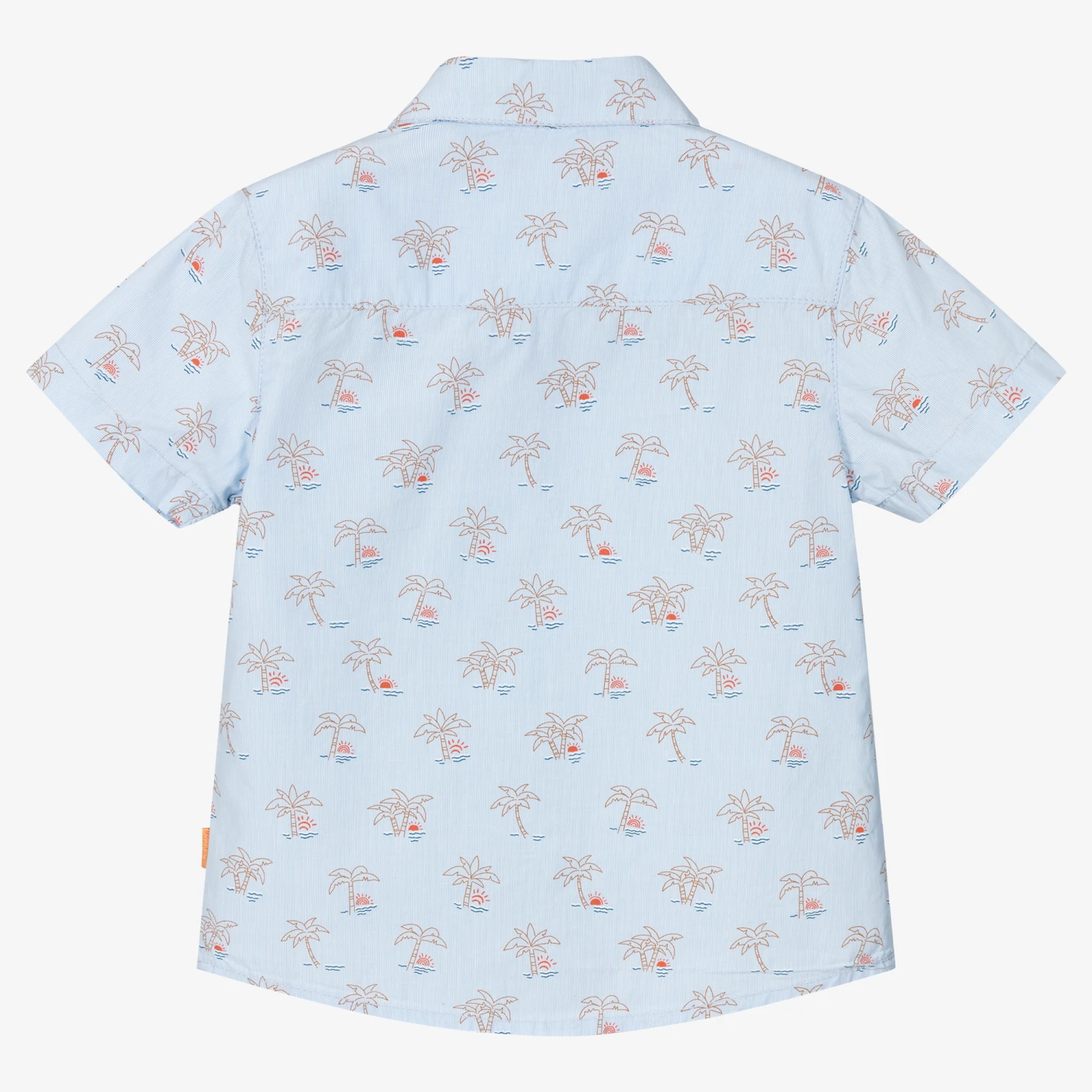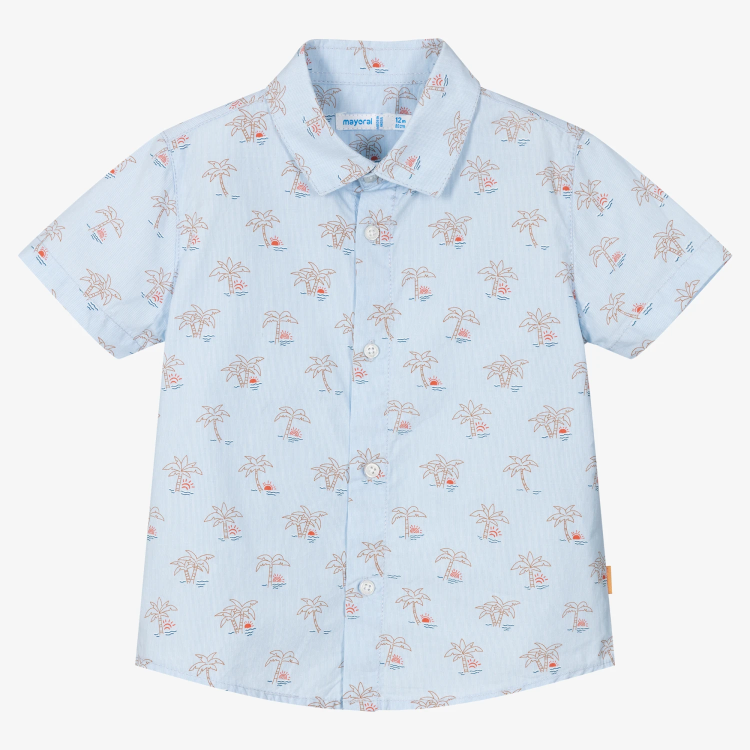 Classic blue striped shirt for little boys by Spanish brand Mayoral, with a summery palm tree and sunset print. Made in soft breathable cotton poplin, this short-sleeved shirt has a pointed collar and button fastenings on the front.