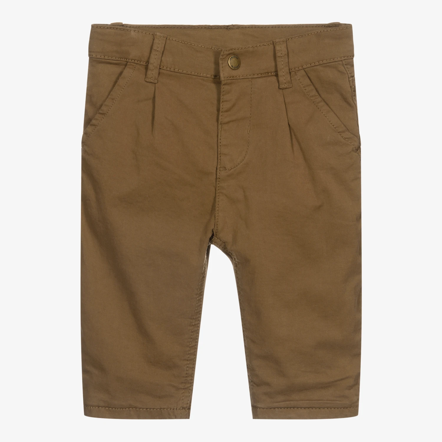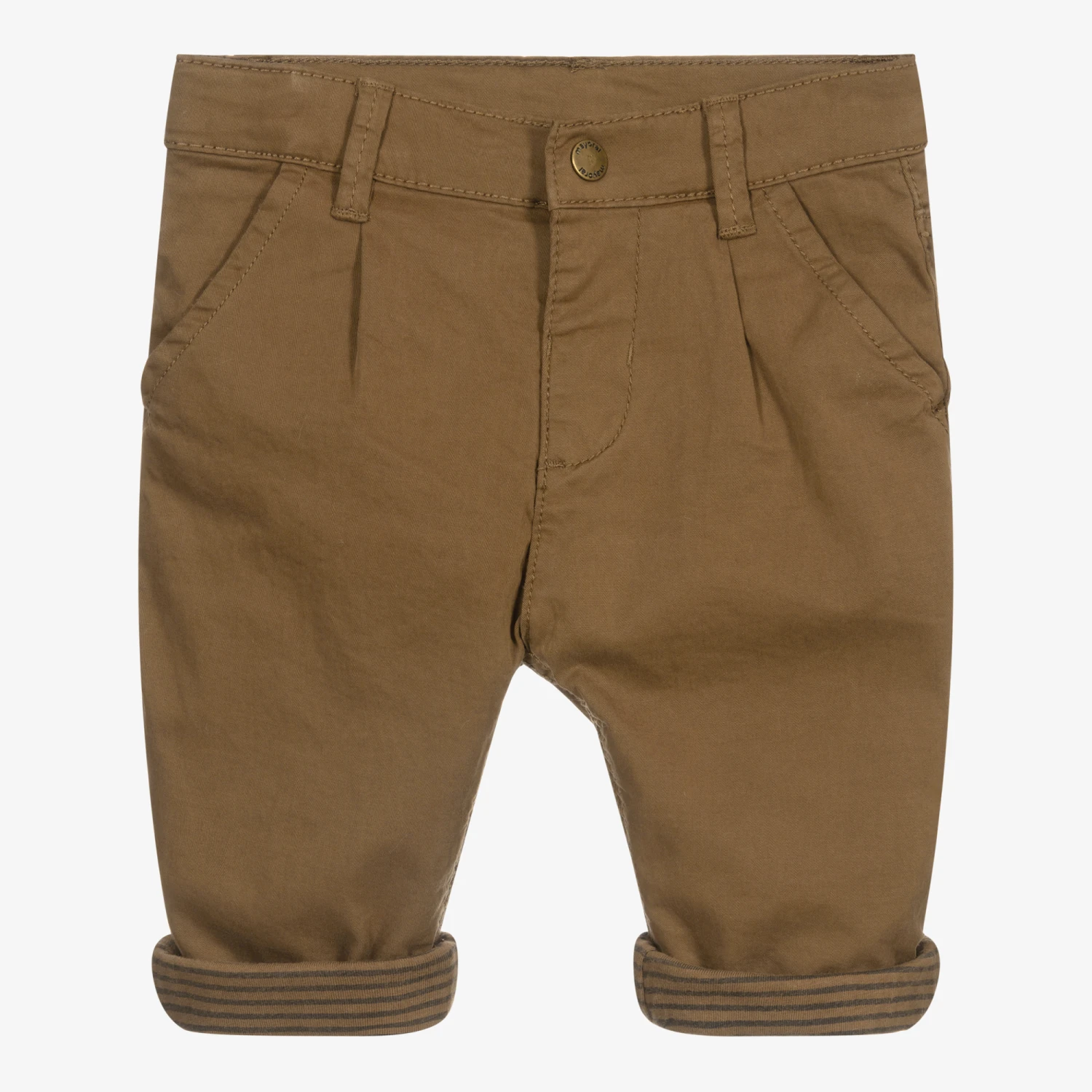 Brown slouchy trousers for little boys by Mayoral. They are made in stretchy cotton twill and have a soft jersey lining. The waistband is adjustable and fastens with a single popper.
