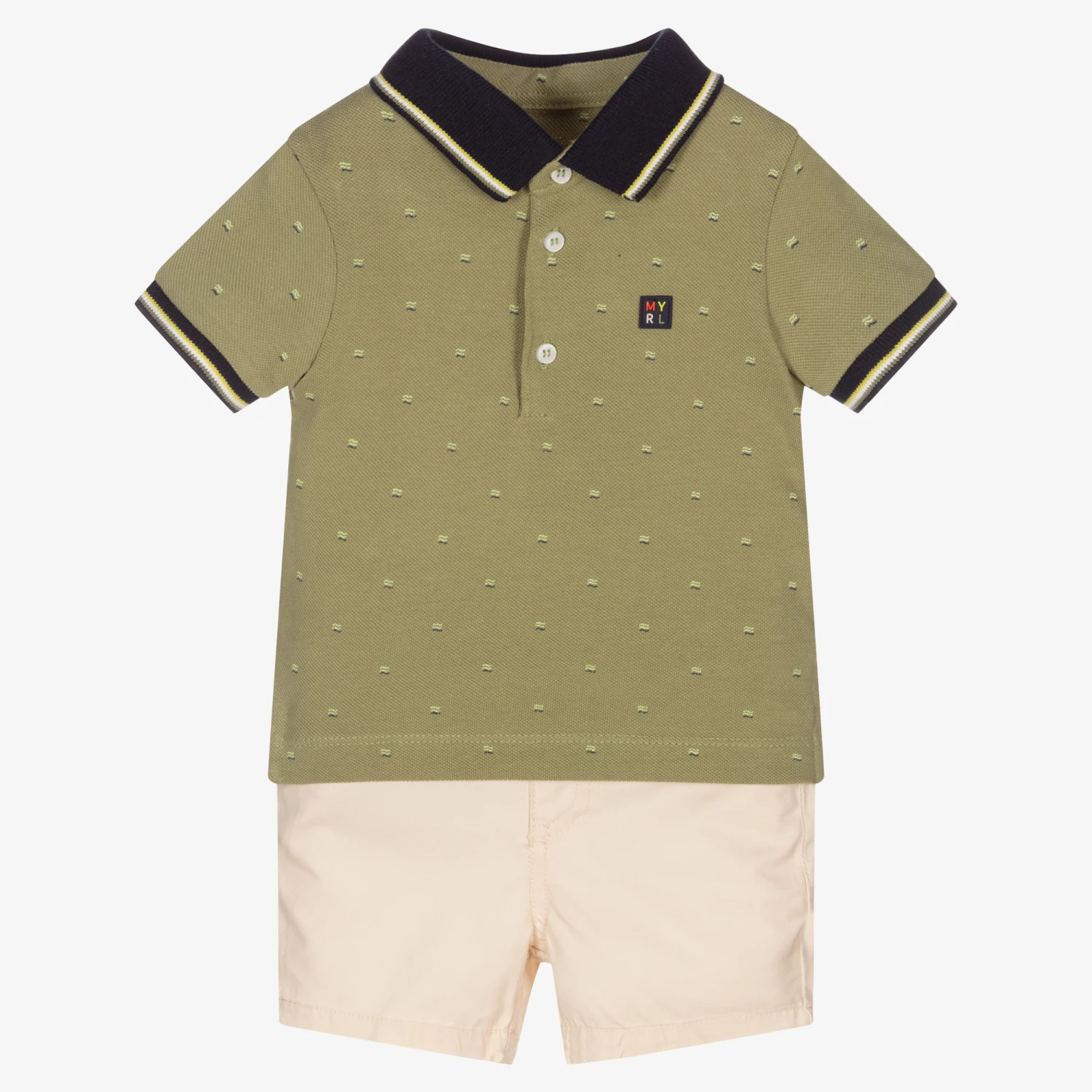 A green and beige cotton shorts set for little boys by Mayoral. The green polo shirt is made in soft piqué with navy blue, green and white striped trim and a matching ditsy flag print. The beige twill shorts have five pockets, with an adjustable waistband and popper fastening.