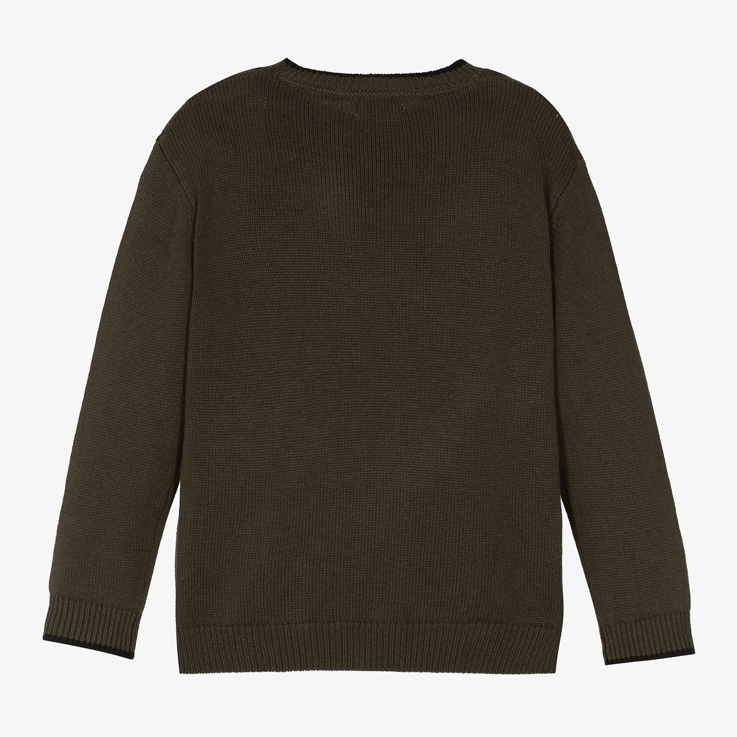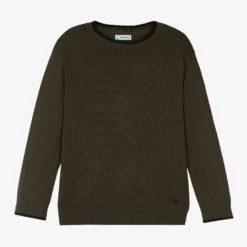 Lovely khaki green sweater for boys by Mayoral. Comfortable and easy to pair with just about anything, it is made from soft cotton and wool blend in a mid-weight ribbed knit. It has black rim on the ribbed trims and an embroidered black logo by the hem, for a subtle branded look.