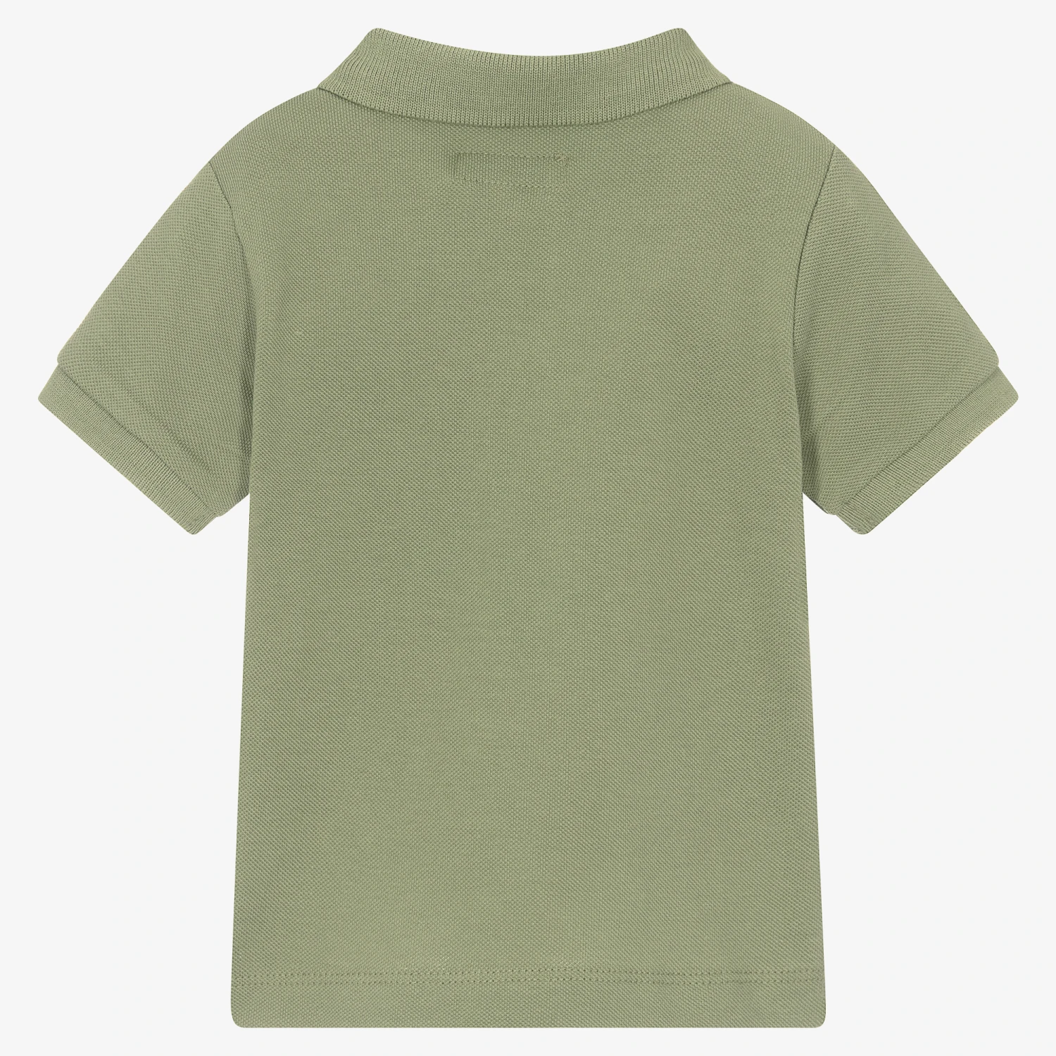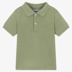 Classic khaki green polo shirt for little boys by Spanish brand Mayoral, made in soft sustainable cotton piqué. It has button fastenings, a tonal rubberised logo on the chest, and ribbed trims.