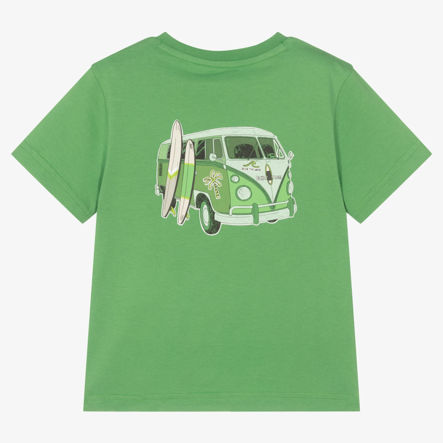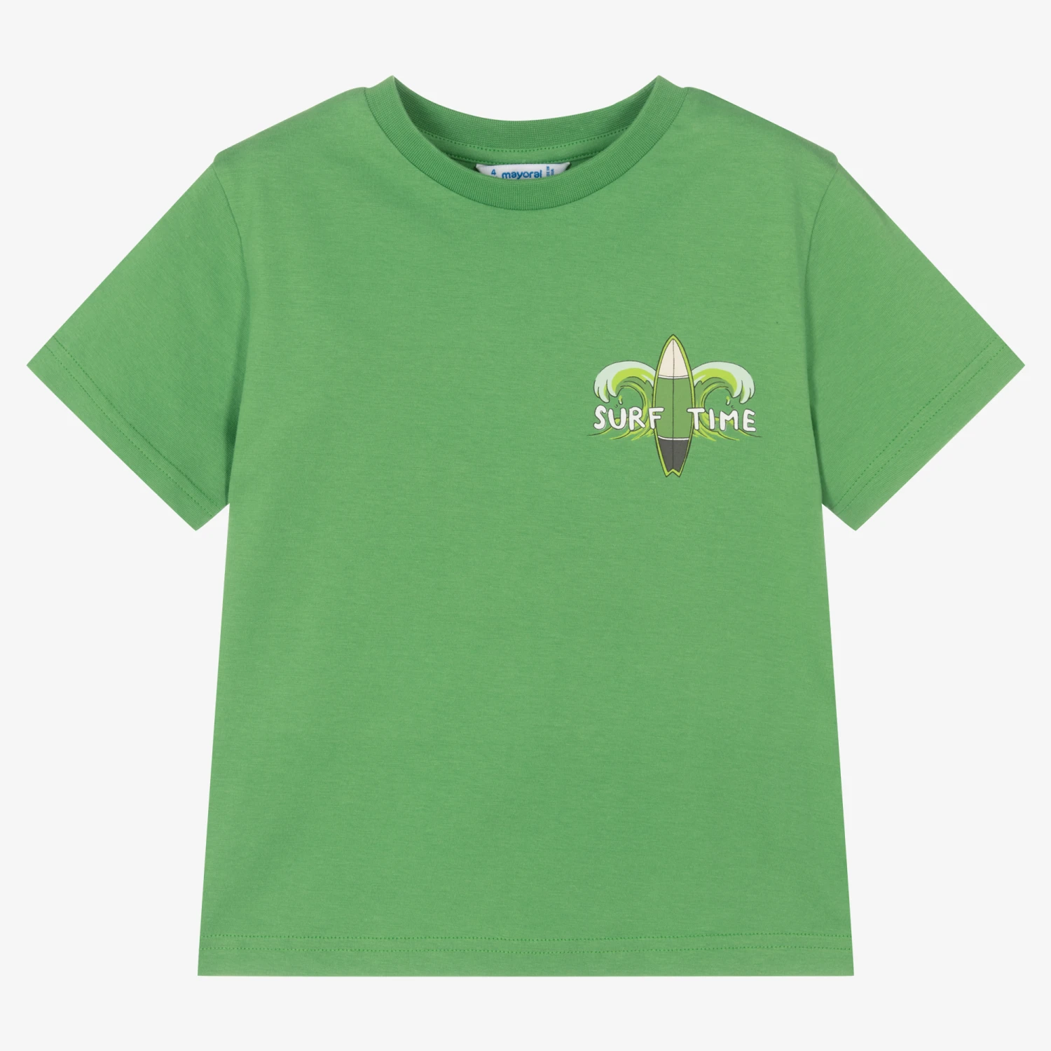 Green sustainable cotton T-shirt for boys by Spanish brand Mayoral, with a surf-themed print on the front and back. It is made in comfortable jersey, ideal for relaxed days.