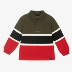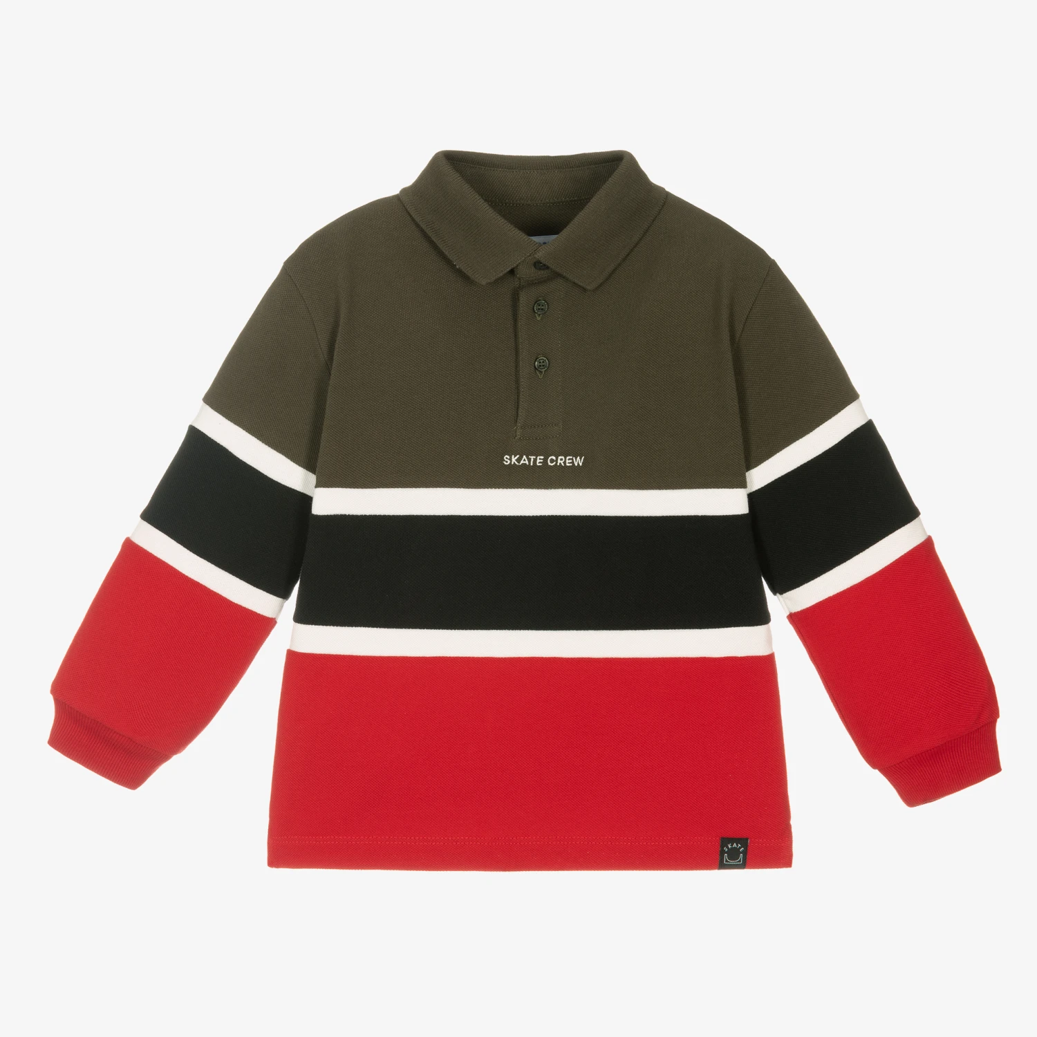 Green and red polo shirt for boys by Mayoral, with black and white stripes across the middle. Made in comfortable, sustainable cotton piqué, it has logo buttons on the placket with ‘Skate Crew’ embroidered below in white. It has ribbed trims and a fabric ‘skate’ tab on the hemline.