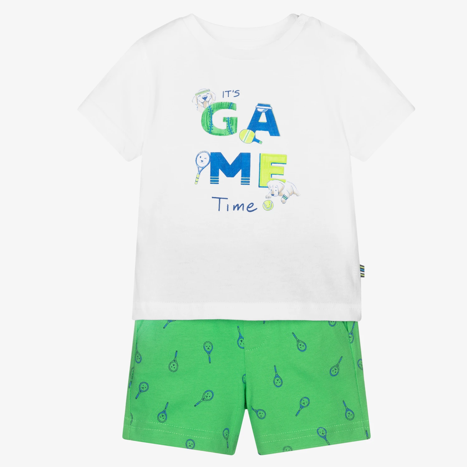 Boys green and white T-shirt and shorts set by Mayoral, made in soft, stretchy sustainable cotton. The T-shirt has a fun statement saying ‘It’s Game Time’, with a little dog and tennis racket print on the front. The shorts have a elasticated drawstring waistband and a cute tennis themed print.