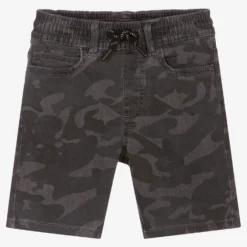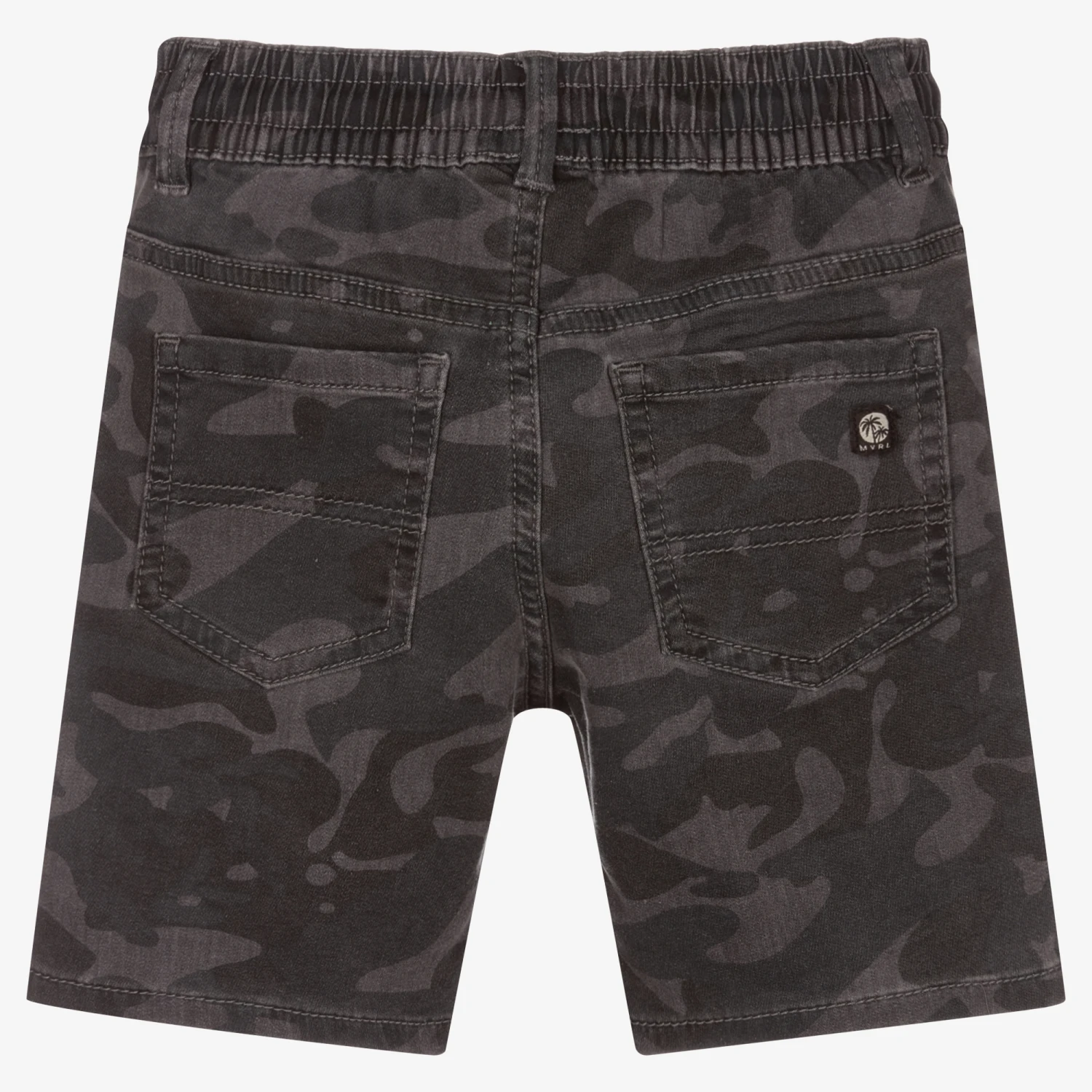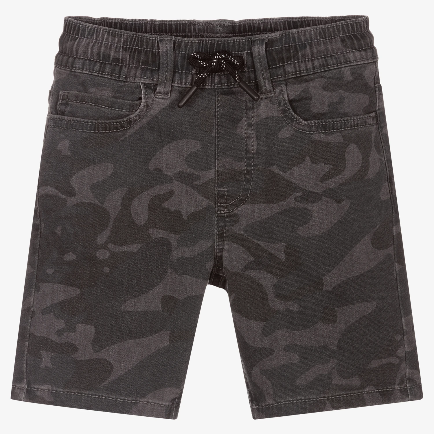 Grey shorts for boys by Mayoral, made in soft and stretchy organic cotton jersey with the look of denim. They have an all-over camouflage print and are in the classic five pocket style. They have an elasticated, drawstring waistband.